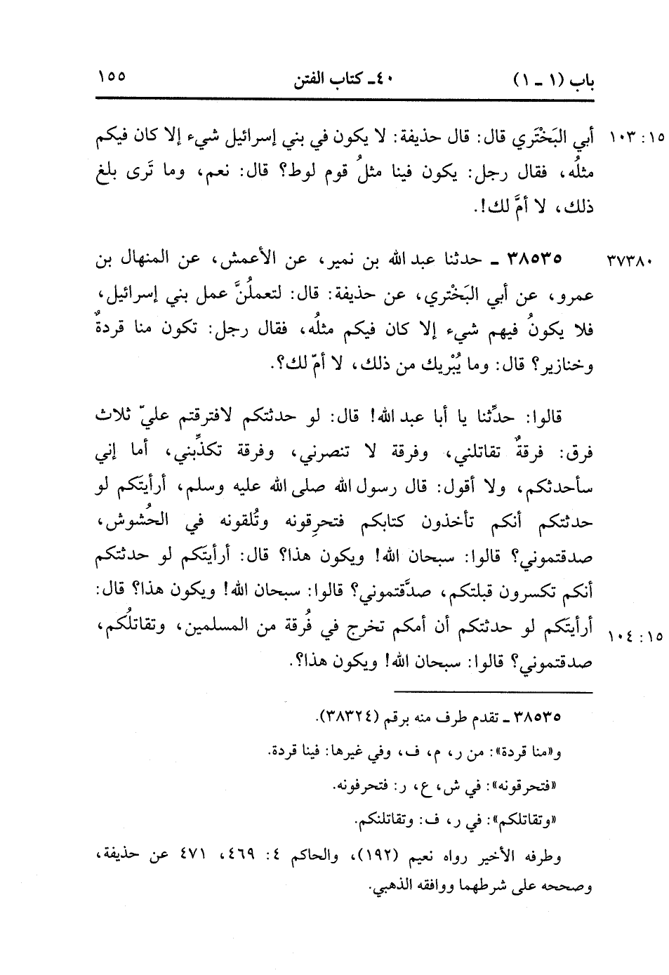 38535- حَدَّثَنَا عَبْدُ اللهِ بْنُ نُمَيْرٍ ، عَنِ الأَعْمَشِ ، عَنِ الْمِنْهَالِ بْن عَمْرٍو ، عَنْ أَبِي الْبَخْتَرِيِّ ، عَنْ حُذَيْفَةَ : قَالَ : لَتَعْمَلُنَّ عَمَلَ بَنِي إسْرَائِيلَ فَلاَ يَكُونُ فِيهِمْ شَيْءٌ إِلاَّ كَانَ فِيكُمْ مِثْلُهُ ، فَقَالَ رَجُلٌ : تَكُونُ منَّا قِرَدَةٌ وَخَنَازِيرُ ، قَالَ : وَمَا يُبْرِيكَ مِنْ ذَلِكَ ، لاَ أُمَّ لَكَ ، قَالُوا : حَدِّثْنَا يَا أَبَا عَبْدِ اللهِ ، قَالَ : لَوْ حَدَّثْتُكُمْ لاَفْتَرَقْتُمْ عَلَى ثَلاَثِ فِرَقٍ : فِرْقَةٍ تُقَاتِلنِي ، وَفِرْقَةٍ لاَ تَنْصُرُنِي ، وَفِرْقَةٍ تُكَذِّبُنِي أَمَا إنِّي سَأُحَدِّثُكُمْ وَلاَ أَقُولُ : قَالَ رَسُولُ اللهِ صَلَّى الله عَلَيْهِ وَسَلَّمَ : أَرَأَيْتُكُمْ لَوْ حَدَّثْتُكُمْ أَنَّكُمْ تَأْخُذُونَ كِتَابَكُمْ فَتُحَرِّقُونَهُ وَتُلْقُونَهُ فِي الْحُشُوشِ ، صَدَّقْتُمُونِي ، قَالُوا : سُبْحَانَ اللهِ ، وَيَكُونُ هَذَا ، قَالَ : أَرَأَيْتُكُمْ لَوْ حَدَّثْتُكُمْ أَنَّكُمْ تَكْسِرُونَ قِبْلَتَكُمْ ، صَدَّقْتُمُونِي ، قَالُوا : سُبْحَانَ اللهِ ، وَيَكُونُ هَذَا ، قَالَ : أَرَأَيْتُكُمْ لَوْ حَدَّثْتُكُمْ ، أَنَّ أُمَّكُمْ تَخْرُجُ فِي فِرْقَةٍ مِنَ الْمُسْلِمِينَ وَتُقَاتِلُكُمْ ، صَدَّقْتُمُونِي ، قَالُوا : سُبْحَانَ اللهِ وَيَكُونُ هَذَا. (15/103).
