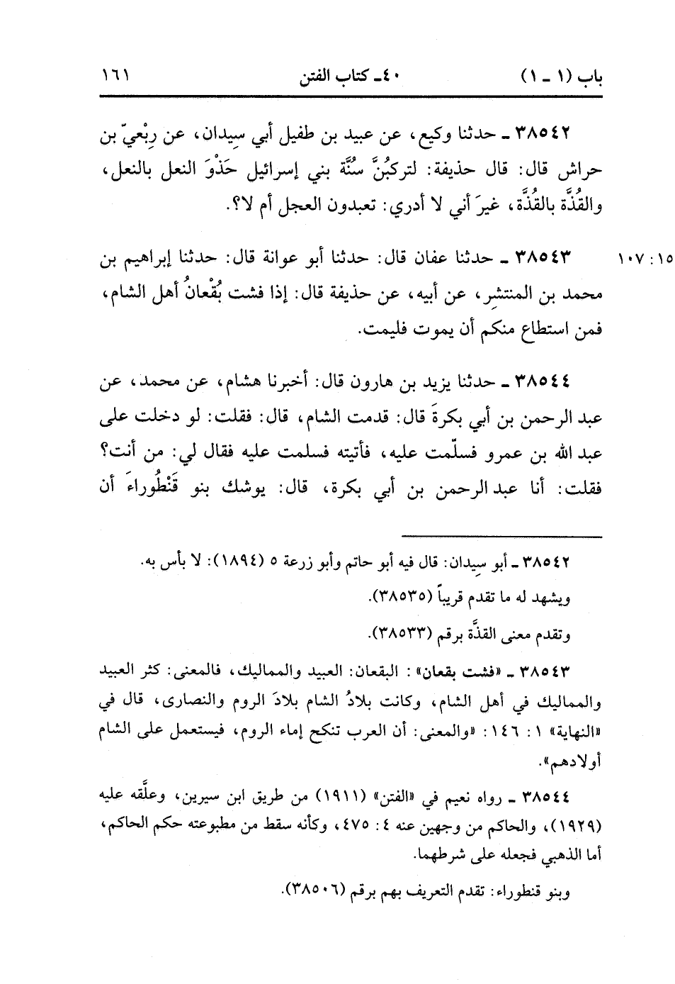 38544- حَدَّثَنَا يَزِيدُ بْنُ هَارُونَ , قَالَ : أَخْبَرَنَا هِشَامٌ ، عَنْ مُحَمَّدٍ ، عَنْ عَبْدِ الرَّحْمَنِ بْنِ أَبِي بَكْرَةَ ، قَالَ : قَدِمْت الشَّامَ ، قَالَ : فَقُلْتُ : لَوْ دَخَلْتَ عَلَى عَبْدِ اللهِ بْنِ عَمْرٍو فَسَلَّمْتَ عَلَيْهِ , فَأَتَيْته فَسَلَّمْتُ عَلَيْهِ ، فَقَالَ لِي : مَنْ أَنْتَ ؟ فَقُلْتُ : أَنَا عَبْدُ الرَّحْمَنِ بْنُ أَبِي بَكْرَةَ ، قَالَ : يُوشِكُ بَنُو قنطوراء أَنْ يُخْرِجُوكُمْ مِنْ أَرْضِ الْعِرَاقِ ، قُلْتُ : ثُمَّ نَعُودُ ؟ قَالَ : أَنْتَ تَشْتَهِي ذَاكَ ؟ قُلْتُ : نَعَمْ ، قَالَ : وَتَكُونُ لَكُمْ سَلْوَةٌ مِنْ عَيْشٍ. (15/107).