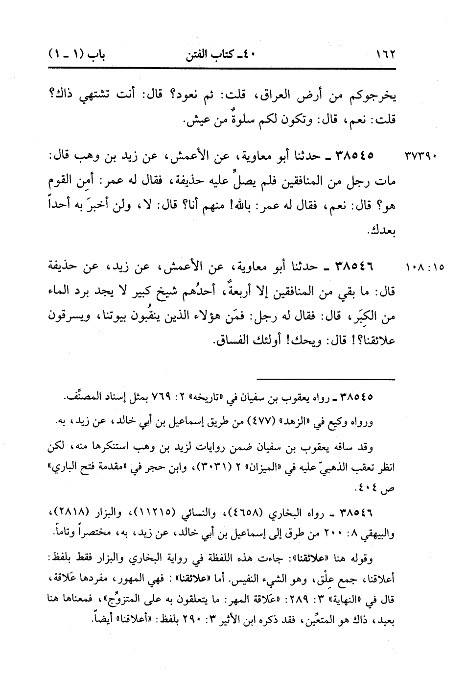 38546- حَدَّثَنَا أَبُو مُعَاوِيَةَ ، عَنِ الأَعْمَشِ ، عَنْ زَيْدٍ ، عَنْ حُذَيْفَةَ ، قَالَ : مَا بَقِيَ مِنَ الْمُنَافِقِينَ إِلاَّ أَرْبَعَةٌ ، أَحَدُهُمْ شَيْخٌ كَبِيرٌ لاَ يَجِدُ بَرْدَ الْمَاءِ مِنَ الْكِبَرِ ، قَالَ : فَقَالَ لَهُ رَجُلٌ : فَمَنْ هَؤُلاَءِ الَّذِينَ يَنْقُبُونَ بُيُوتَنَا وَيَسْرِقُونَ عَلاَئِقَنَا ، قَالَ : وَيْحَك ، أُولَئِكَ الْفُسَّاقُ. (15/108).