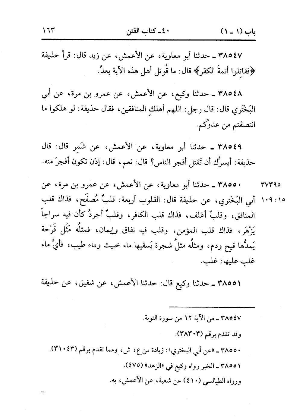 38550- حَدَّثَنَا أَبُو مُعَاوِيَةَ ، عَنِ الأَعْمَشِ ، عَنْ عَمْرِو بْنِ مُرَّةَ ، عَنْ أَبِي الْبَخْتَرِيِّ ، عَنْ حُذَيْفَةَ ، قَالَ : الْقُلُوبُ أَرْبَعَةٌ : قَلْبٌ مُصَفَحٌ فَذَاكَ قَلْبُ الْمُنَافِقِ ، وَقَلْبٌ أَغْلَفُ ، فَذَاكَ قَلْبُ الْكَافِرِ ، وَقَلْبٌ أَجْرَدُ كَأَنَّ فِيهِ سِرَاجًا يَزْهر ، فَذَاكَ قَلْبُ الْمُؤْمِنِ ، وَقَلْبٌ فِيهِ نِفَاقٌ وَإِيمَانٌ فَمِثْلُهُ مِثْلُ قُرْحَةٍ يَمُدُّهَا قَيْحٌ وَدَمٌ ، وَمِثْلُهُ مِثْلُ شَجَرَةٍ يَسْقِيهَا مَاءٌ خَبِيثٌ وَمَاءٌ طَيِّبٌ ، فَأَيُّ مَاءٍ غَلَبَ عَلَيْهَا ؛ غَلَبَ. (15/108).