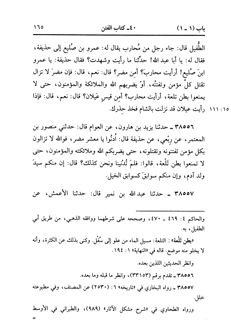 38555- حَدَّثَنَا عَلِيُّ بْنُ مُسْهِرٍ ، عَنِ الْوَلِيدِ بْنِ جُمَيْعٍ ، عَنْ أَبِي الطُّفَيْلِ ، قَالَ : جَاءَ رَجُلٌ مِنْ مُحَارِبٍ يُقَالُ لَهُ عَمْرُو بْنُ صُلَيعٍ إِلَى حُذَيْفَةَ ، فَقَالَ لَهُ : يَا أَبَا عَبْدِ اللهِ ، حَدِّثْنَا مَا رَأَيْت وَشَهِدْت ؟ فَقَالَ حُذَيْفَةُ : يَا عَمْرُو بْنَ صُلَيعٍ ، أَرَأَيْت مُحَارِبَ ؟ أَمِنْ مُضَرَ ، قَالَ : نَعَمْ ، قَالَ : فَإِنَّ مُضَرَ لاَ تَزَالُ تَقْتُلُ كُلَّ مُؤْمِنٍ وَتَفْتِنُهُ ، أَوْ يَضْرِبُهُمَ اللَّهُ وَالْمَلاَئِكَةُ وَالْمُؤْمِنُونَ حَتَّى لاَ يَمْنَعُوا بَطْنَ تَلْعَةٍ ، أَرَأَيْت مُحَارِبَ ؟ أَمِنْ قَيْسَ عَيْلاَنَ ، قَالَ : نَعَمْ ، فَإِذَا رَأَيْت عَيْلاَنَ قَدْ نَزَلَتْ بِالشَّامِ فَخُذْ حِذْرَك. (15/110)