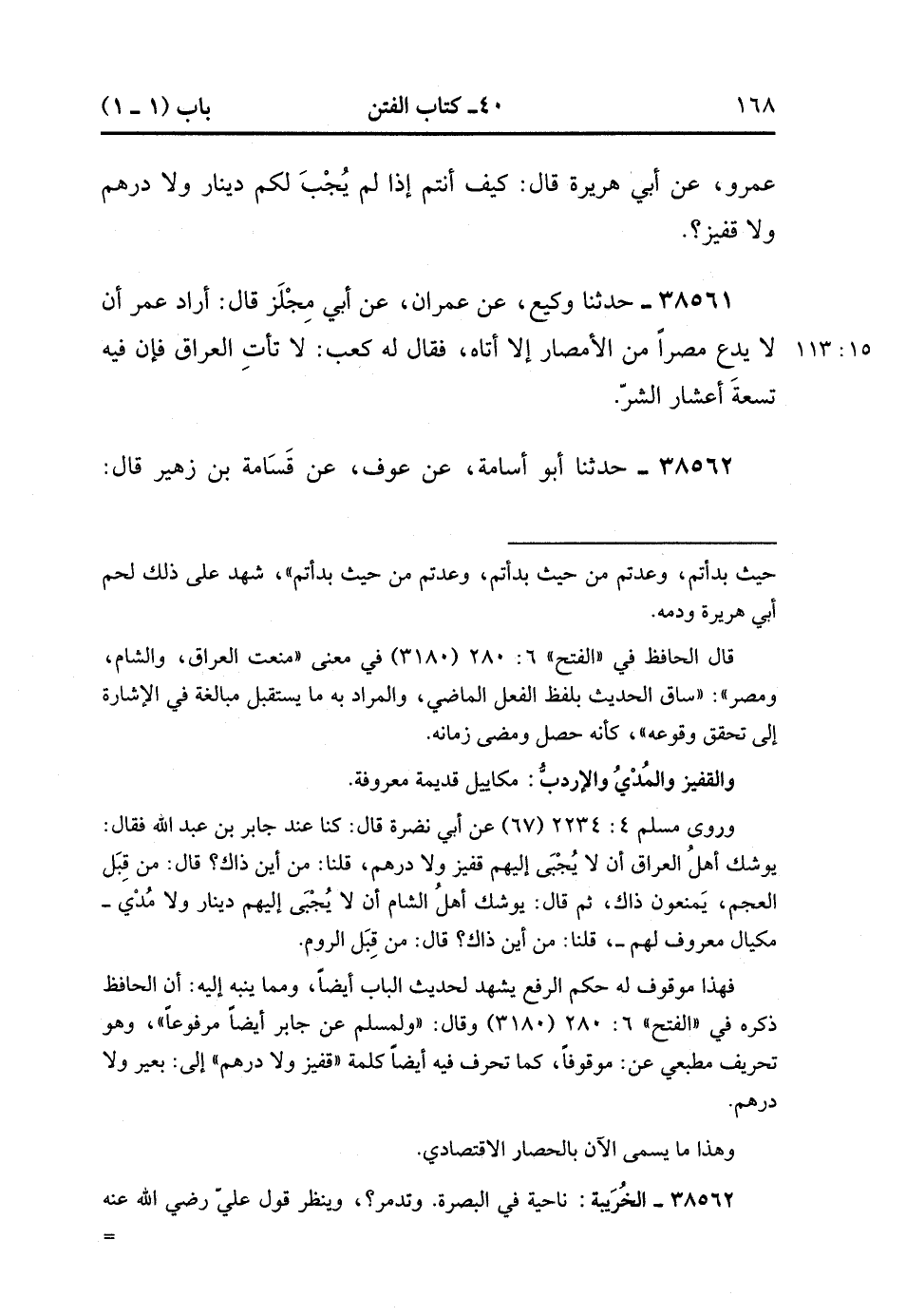 38561- حَدَّثَنَا وَكِيعٌ ، عَنْ عِمْرَانَ ، عَنْ أَبِي مِجْلَزٍ ، قَالَ : أَرَادَ عُمَرُ أَنْ لاَ يَدَعَ مِصْرًا مِنَ الأَمْصَارِ إِلاَّ أَتَاهُ ، فَقَالَ لَهُ كَعْبٌ : لاَ تَأْتِ الْعِرَاقَ فَإِنَّ فِيهِ تِسْعَةَ أَعْشَارِ الشَّرِّ. (15/112)