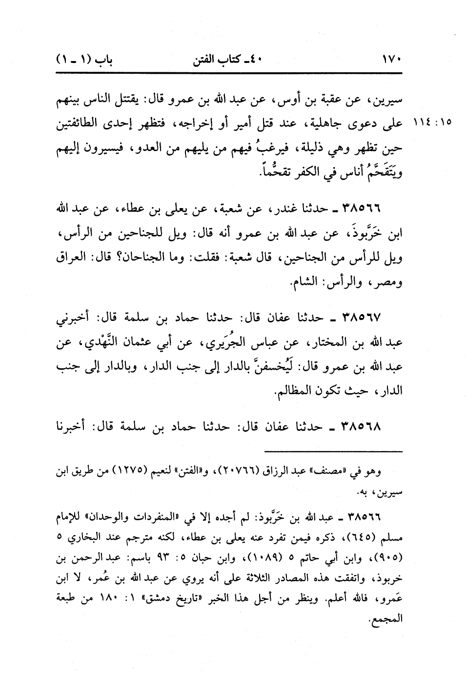 38566- حَدَّثَنَا غُنْدَرٌ ، عَنْ شُعْبَةَ ، عَنْ يَعْلَى بْنِ عَطَاءٍ ، عَنْ عَبْدِ اللهِ بْنِ خَرَّبُوذَ ، عَنْ عَبْدِ اللهِ بْنِ عَمْرٍو ، أَنَّهُ قَالَ : وَيْلٌ لِلْجَنَاحَيْنِ مِنَ الرَّأْسِ ، وَيْلٌ لِلرَّأْسِ مِنَ الْجَنَاحَيْنِ ، قَالَ شُعْبَةُ : فَقُلْتُ : وَمَا الْجَنَاحَانِ ، قَالَ : الْعِرَاقُ وَمِصْرُ ، وَالرَّأْسُ : الشَّامُ.