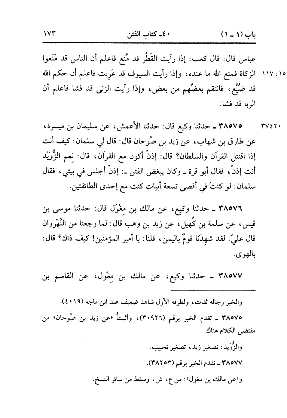 38575- حَدَّثَنَا وَكِيعٌ , قَالَ : حدَّثَنَا الأَعْمَشُ ، عَنْ سُلَيْمَانَ بْنِ مَيْسَرَةَ ، عَنْ طَارِقِ بْنِ شِهَابٍ ، عَنْ زَيْدِ بْنِ صُوحَانَ ، قَالَ : قَالَ لِي سَلْمَانُ : كَيْفَ أَنْتَ إِذَا اقْتَتَلَ الْقُرْآنُ وَالسُّلْطَانُ ، قَالَ : إذًا أَكُونُ مَعَ الْقُرْآنِ ، قَالَ : نِعْمَ الزويد أَنْتَ إذًا ، فَقَالَ أَبُو قُرَّةَ وَكَانَ يَبْغَضُ الْفِتَنَ : إذًا أَجْلِسُ فِي بَيْتِي ، فَقَالَ سَلْمَانُ : لَوْ كُنْت فِي أَقْصَى تِسْعَةِ أَبْيَاتٍ كُنْت مَعَ إحْدَى الطَّائِفَتَيْنِ.