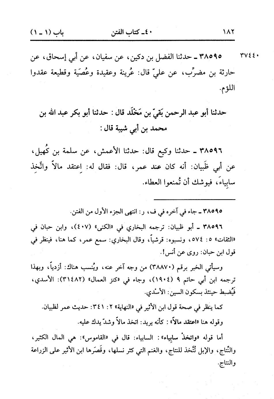 38596- حَدَّثَنَا وَكِيعٌ ، قَالَ : حَدَّثَنَا الأَعْمَشُ ، عَنْ سَلَمَةَ بْنِ كُهَيْلٍ ، عَنْ أَبِي ظَبْيَانَ ، أَنَّهُ كَانَ عِنْدَ عُمَرَ ، قَالَ : فَقَالَ لَهُ : اعْتَقِدْ مَالاً وَاِتَّخِذْ سَابياء , فَيُوشِكُ أَنْ تُمْنَعُوا الْعَطَاءَ. (15/124).