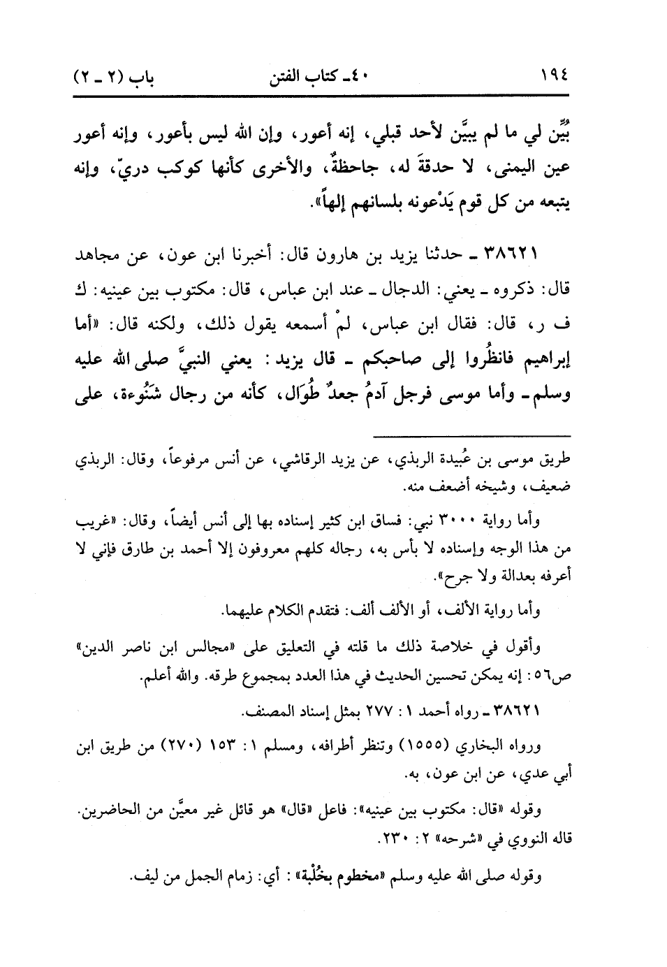 38621- حَدَّثَنَا يَزِيدُ بْنُ هَارُونَ , قَالَ : أَخْبَرَنَا ابْنُ عَوْنٍ ، عَنْ مُجَاهِدٍ ، قَالَ : ذَكَرُوهُ ، يَعْنِي الدَّجَّالَ ، عِنْدَ ابْنِ عَبَّاسٍ ، قَالَ : مَكْتُوبٌ بَيْنَ عَيْنَيْهِ : ك ف ر ، قَالَ : فَقَالَ ابْنُ عَبَّاسٍ : لَمْ أَسْمَعْهُ يَقُولُ ذَلِكَ ، وَلَكِنَّهُ قَالَ : أَمَّا إبْرَاهِيمُ ، فَانْظُرُوا إِلَى صَاحِبِكُمْ ، (قَالَ يَزِيدُ : يَعْنِي النَّبِيَّ صَلَّى الله عَلَيْهِ وَسَلَّمَ) ، وَأَمَّا مُوسَى ، فَرَجُلٌ آدَمُ ، جَعْدٌ طُوَالٌ ، كَأَنَّهُ مِنْ رِجَالِ شَنُوءَةَ ، عَلَى جَمَلٍ أَحْمَرَ ، مَخْطُومٍ بِخُلْبَةٍ ، فَكَأَنِّي أَنْظُرُ إلَيْهِ قَد انْحَدَرَ مِنَ الْوَادِي يُلَبِّي. (15/131).