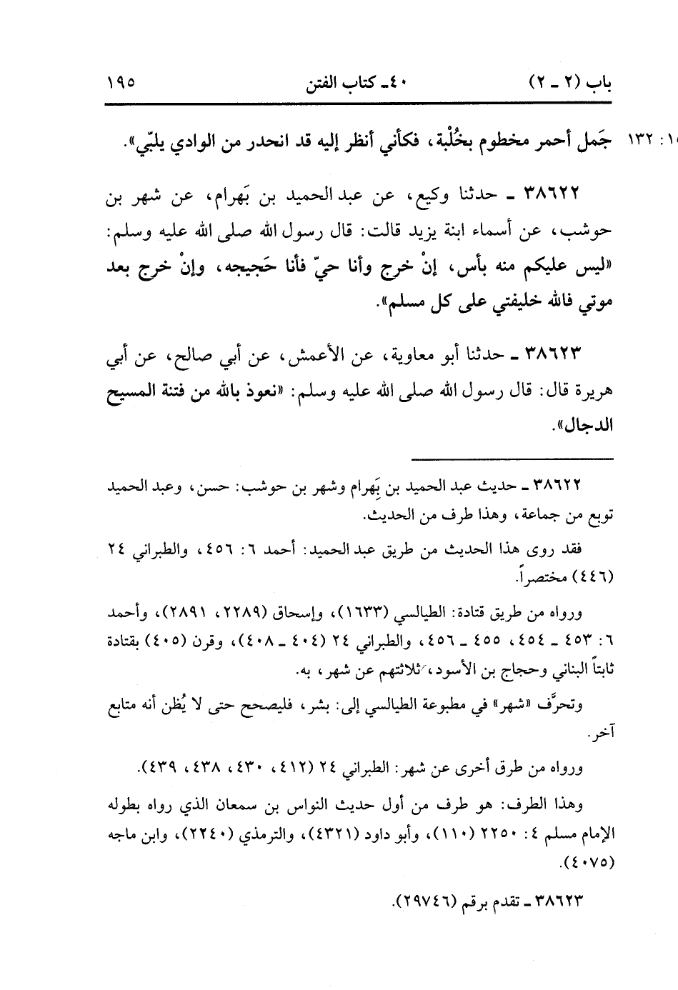 38623- حَدَّثَنَا أَبُو مُعَاوِيَةَ ، عَنِ الأَعْمَشِ ، عَنْ أَبِي صَالِحٍ ، عَنْ أَبِي هُرَيْرَةَ ، قَالَ : قَالَ رَسُولُ اللهِ صَلَّى الله عَلَيْهِ وَسَلَّمَ : نَعُوذُ بِاللهِ مِنْ فِتْنَةِ الْمَسِيحِ الدَّجَّالِ. (15/132).
