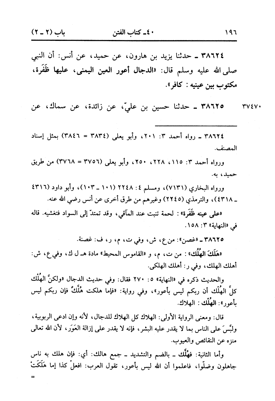 38625- حَدَّثَنَا حُسَيْنُ بْنُ عَلِيٍّ ، عَنْ زَائِدَةَ ، عَنْ سِمَاكٍ ، عَنْ عِكْرِمَةَ ، عَنِ ابْنِ عَبَّاسٍ ، عَنِ النَّبِيِّ صَلَّى الله عَلَيْهِ وَسَلَّمَ ، قَالَ : إِنَّ الدَّجَّالَ أَعْوَرُ جَعْدٌ هِجَانٌ أَقْمَرُ , كَأَنَّ رَأْسَهُ غَصْنَةُ شَجَرَةٍ ، أَشْبَهُ النَّاسِ بِعَبْدِ الْعُزَّى بْنِ قَطَنٍ ، فَإِمَّا هَلَكَ الْهُلُكُ فَإِنَّهُ أَعْوَرُ ، وَإِنَّ اللَّهَ لَيْسَ بِأَعْوَرَ. (15/132).