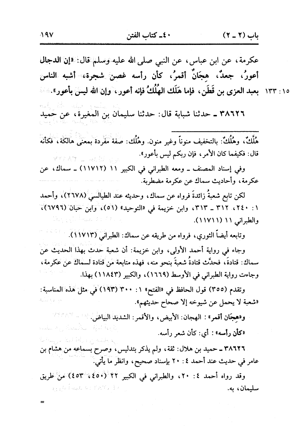 38626- حَدَّثَنَا شَبَابَةُ , قَالَ : حدَّثَنَا سُلَيْمَانُ بْنُ الْمُغِيرَةِ ، عَنْ حُمَيْدِ بْنِ هِلاَلٍ ، قَالَ : كَانَ هِشَامُ بْنُ عَامِرٍ الأَنْصَارِيُّ يَرَى رِجَالاً يَتَخَطَّوْنَهُ إِلَى عِمْرَانَ بْنِ حُصَيْنٍ وَغَيْرِهِ مِنْ أَصْحَابِ النَّبِيِّ صَلَّى الله عَلَيْهِ وَسَلَّمَ فَغَضِبَ ، وَقَالَ : وَاللهِ إنَّكُمْ لَتَخْطَوْنَ إِلَى مَنْ لَمْ يَكُنْ أَحْضَرَ لِرَسُولِ اللهِ مِنِّي وَلاَ أَوْعَى لِحَدِيثِهِ مِنِّي ، لَقَدْ سَمِعْتُ رَسُولَ اللهِ صَلَّى الله عَلَيْهِ وَسَلَّمَ يَقُولُ : مَا بَيْنَ خَلْقِ آدَمَ إِلَى أَنْ تَقُومَ السَّاعَةُ فِتْنَةٌ أَكْبَرُ مِنْ فِتْنَةِ الدَّجَّالِ. (15/133).