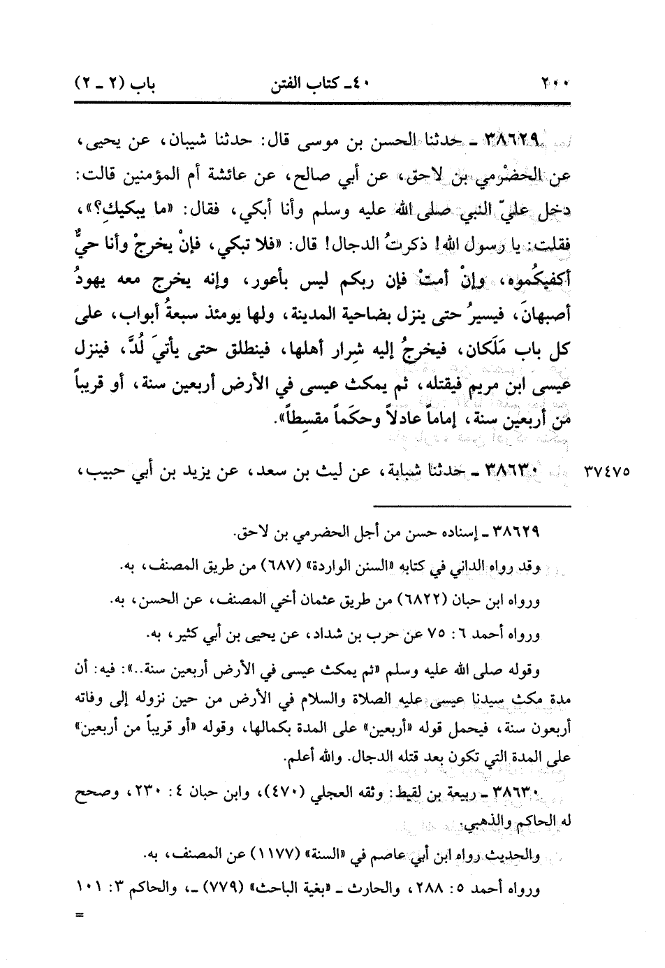 38629- حَدَّثَنَا الْحَسَنُ بْنُ مُوسَى , قَالَ : حدَّثَنَا شَيْبَانُ ، عَنْ يَحْيَى ، عَنِ الْحَضْرَمِيِّ بْنِ لاَحِقٍ ، عَنْ أَبِي صَالِحٍ ، عَنْ عَائِشَةَ أُمِّ الْمُؤْمِنِينَ ، قَالَتْ : دَخَلَ عَلَيَّ النَّبِيُّ صَلَّى الله عَلَيْهِ وَسَلَّمَ وَأَنَا أَبْكِي ، فَقَالَ : مَا يُبْكِيك ؟ فَقُلْتُ : يَا رَسُولَ اللهِ ، ذَكَرْت الدَّجَّالَ ، قَالَ : فَلاَ تَبْكِي فَإِنْ يَخْرُجْ وَأَنَا حَيٌّ أَكْفِيكُمُوهُ ، وَإِنْ أَمُتْ فَإِنَّ رَبَّكُمْ لَيْسَ بِأَعْوَرَ ، وَإِنَّهُ يَخْرُجُ مَعَهُ يَهُودُ أَصْبَهَانَ ، فَيَسِيرُ حَتَّى يَنْزِلَ بِضَاحِيَةِ الْمَدِينَةِ ، وَلَهَا يَوْمَئِذٍ سَبْعَةُ أَبْوَابٍ ، عَلَى كُلِّ بَابٍ مَلَكَانِ ، فَيَخْرُجُ إلَيْهِ شِرَارُ أَهْلِهَا ، فَيَنْطَلِقُ حَتَّى يَأْتِيَ لُدَّ ، فَيَنْزِلُ عِيسَى ابْنُ مَرْيَمَ فَيَقْتُلُهُ ، ثُمَّ يَمْكُثُ عِيسَى فِي الأَرْضِ أَرْبَعِينَ سَنَةً ، أَوْ قَرِيبًا مِنْ أَرْبَعِينَ سَنَةً إمَامًا عَادِلاً وَحَكَمًا مُقْسِطًا. (15/134).