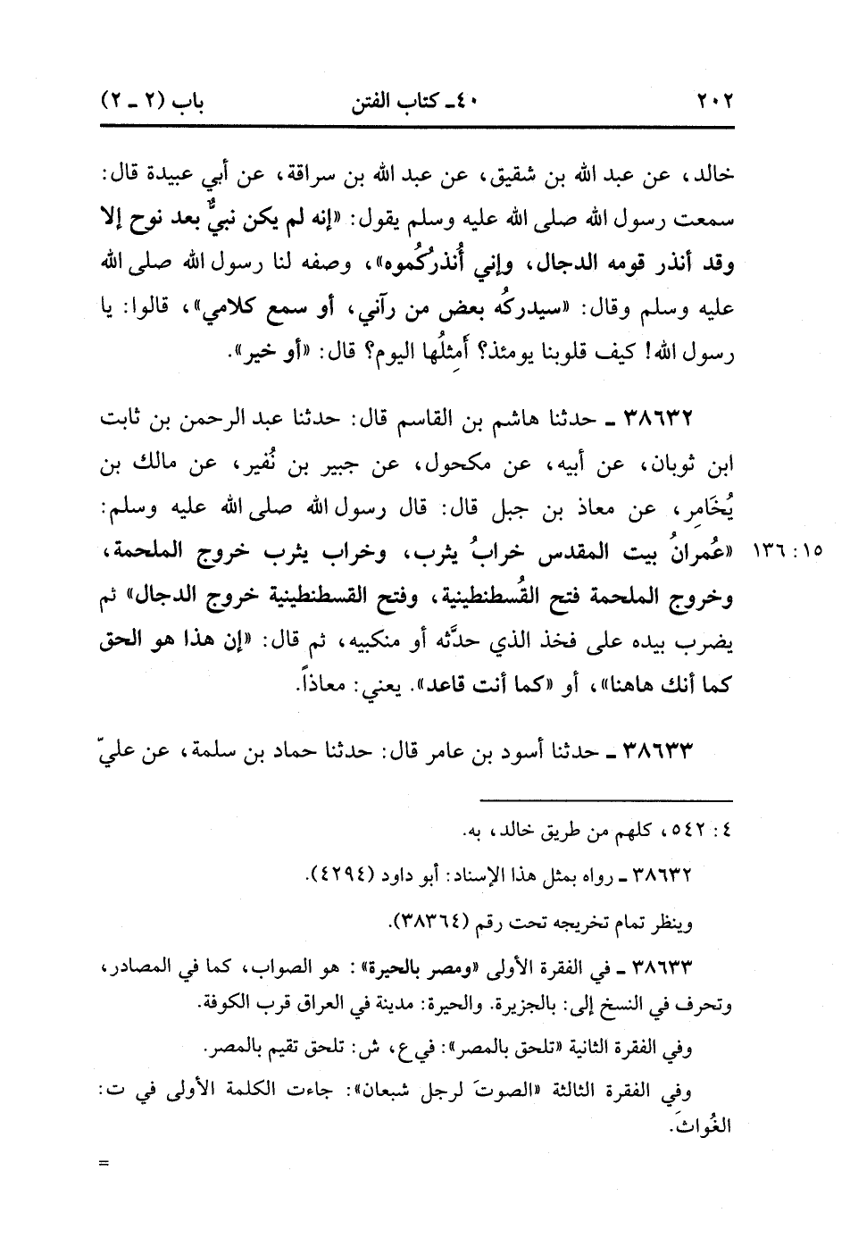 38632- حَدَّثَنَا هَاشِمُ بْنُ الْقَاسِمِ ، قَالَ : حَدَّثَنَا عَبْدُ الرَّحْمَنِ بْنُ ثَابِتٍ بْنِ ثَوْبَانَ ، عَنْ أَبِيهِ ، عَنْ مَكْحُولٍ ، عَنْ جُبَيْرِ بْنِ نُفَيْرٍ ، عَنْ مَالِكِ بْنِ يَخَامِرَ ، عَنْ مُعَاذِ بْنِ جَبَلٍ ، قَالَ : قَالَ رَسُولُ اللهِ صَلَّى الله عَلَيْهِ وَسَلَّمَ : عِمْرَانُ بَيْتِ الْمَقْدِسِ خَرَابُ يَثْرِبَ ، وَخَرَابُ يَثْرِبَ خُرُوجُ الْمَلْحَمَةِ ، وَخُرُوجُ الْمَلْحَمَةِ فَتْحُ الْقُسْطَنْطِينِيَّة وَفَتْحُ الْقُسْطَنْطِينِيَّة خُرُوجُ الدَّجَّالِ ، ثُمَّ يَضْرِبُ بِيَدِهِ عَلَى فَخِذِ الَّذِي حَدَّثَهُ ، أَوْ مَنْكِبَيْهِ ، ثُمَّ قَالَ : إِنَّ هَذَا هُوَ الْحَقُّ كَمَا أَنَّك هَاهُنَا ، أَوْ كَمَا أَنْتَ قَاعِدٌ ، يَعْنِي مُعَاذًا. (15/135).