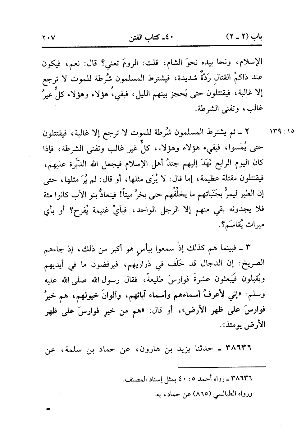 3- فَبَيْنَمَا هُمْ كَذَلِكَ إذْ سَمِعُوا بِبَأْسٍ هُوَ أَكْبَرُ مِنْ ذَلِكَ , إذْ جَاءَهُمَ الصَّرِيخُ ، إِنَّ الدَّجَّالَ قَدْ خُلِّفَ فِي ذَرَارِيِّهِمْ ، فَرَفَضُوا مَا فِي أَيْدِيهِمْ وَيُقْبِلُونَ فَيَبْعَثُونَ عَشَرَةَ فَوَارِسَ طَلِيعَةً ، فَقَالَ رَسُولُ اللهِ صَلَّى الله عَلَيْهِ وَسَلَّمَ : إنِّي لأَعْرِفُ أَسْمَاءَهُمْ وَأَسْمَاءَ آبَائِهِمْ وَأَلْوَانَ خُيُولِهِمْ هُمْ خَيْرُ فَوَارِسَ عَلَى ظَهْرِ الأَرْضِ ، أَوَ قَالَ : هُمْ خَيْرِ فَوَارِسَ عَلَى ظَهْرِ الأَرْضِ يومئذ.