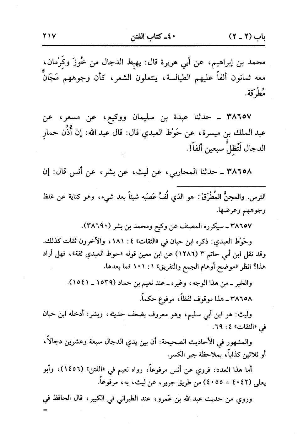 38657- حَدَّثَنَا عَبْدَةُ بْنُ سُلَيْمَانَ وَوَكِيعٌ ، عَنْ مِسْعَرٍ ، عَنْ عَبْدِ الْمَلِكِ بْنِ مَيْسَرَةَ ، عَنْ حَوْطٍ الْعَبْدِيِّ ، قَالَ : قَالَ عَبْدُ اللهِ : إِنَّ أُذُنَ حِمَارِ الدَّجَّالِ لَتُظِلُّ سَبْعِينَ أَلْفًا.