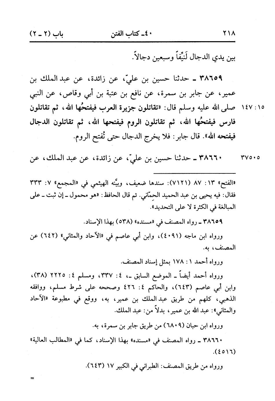 38659- حَدَّثَنَا حُسَيْنُ بْنُ عَلِيٍّ ، عَنْ زَائِدَةَ ، عَنْ عَبْدِ الْمَلِكِ بْنِ عُمَيْرٍ ، عَنْ جَابِرِ بْنِ سَمُرَةَ ، عَنْ نَافِعِ بْنِ عُتْبَةَ بْنِ أَبِي وَقَّاصٍ ، عَنِ النَّبِيِّ صَلَّى الله عَلَيْهِ وَسَلَّمَ قَالَ : تُقَاتِلُونَ جَزِيرَةَ الْعَرَبِ فَيَفْتَحُهَا اللَّهُ ، ثُمَّ تُقَاتِلُونَ فَارِسَ فَيَفْتَحُهَا اللَّهُ ، ثُمَّ تُقَاتِلُونَ الرُّومَ فَيَفْتَحُهَا اللَّهُ ، ثُمَّ تُقَاتِلُونَ الدَّجَّالَ فَيَفْتَحُهُ اللَّهُ ، قَالَ جَابِرٌ : فَلاَ يَخْرُجُ الدَّجَّالُ حَتَّى تُفْتَحَ الرُّومُ. (15/146)