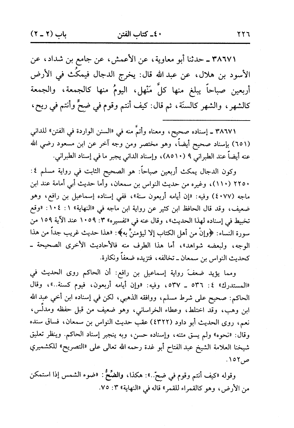 38671- حَدَّثَنَا أَبُو مُعَاوِيَةَ ، عَنِ الأَعْمَشِ ، عَنْ جَامِعِ بْنِ شَدَّادٍ ، عَنِ الأَسْوَدِ بْنِ هِلاَلٍ ، عَنْ عَبْدِ اللهِ ، قَالَ : يَخْرُجُ الدَّجَّالُ فَيَمْكُثُ فِي الأَرْضِ أَرْبَعِينَ صَبَاحًا يَبْلُغُ مِنْهَا كُلَّ مَنْهَلٍ الْيَوْمُ مِنْهَا كَالْجُمُعَةِ ، وَالْجُمُعَةُ كَالشَّهْرِ وَالشَّهْرُ كَالسَّنَةِ ، ثُمَّ قَالَ : كَيْفَ أَنْتُمْ وَقَوْمٌ فِي ضِحٍ وَأَنْتُمْ فِي رِيحٍ ، وَهُمْ شِبَاعٌ وَأَنْتُمْ جِيَاعٌ ، وَهُمْ رِوَاءٌ وَأَنْتُمْ ظِمَاءٌ. (15/153).