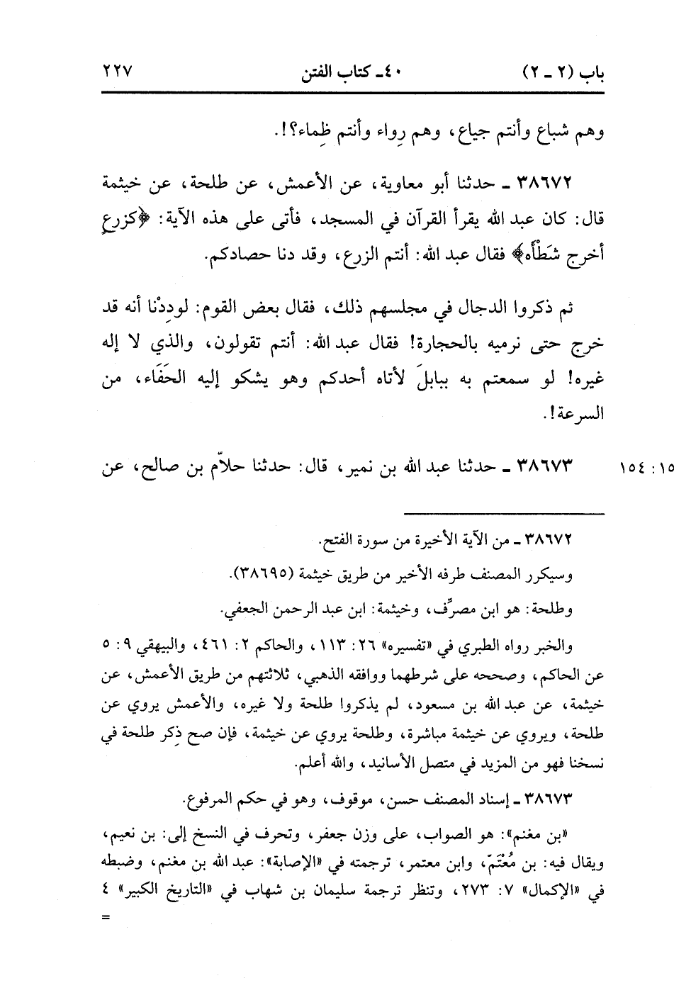 38672- حَدَّثَنَا أَبُو مُعَاوِيَةَ ، عَنِ الأَعْمَشِ ، عَنْ طَلْحَةَ ، عَنْ خَيْثَمَةَ ، قَالَ : كَانَ عَبْدُ اللهِ يَقْرَأُ الْقُرْآنَ فِي الْمَسْجِدِ فَأَتَى عَلَى هَذِهِ الآيَةِ {كَزَرْعٍ أَخْرَجَ شَطْأَهُ} ، فَقَالَ عَبْدُ اللهِ : أَنْتُمَ الزَّرْعُ وَقَدْ دَنَا حَصَادُكُمْ ، ثُمَّ ذَكَرُوا الدَّجَّالَ فِي مَجْلِسِهِمْ ذَلِكَ ، فَقَالَ بَعْضُ الْقَوْمِ : لَوَدِدْنَا أَنَّهُ قَدْ خَرَجَ حَتَّى نَرْمِيَهُ بِالْحِجَارَةِ ، فَقَالَ عَبْدُ اللهِ : أَنْتُمْ تَقُولُونَ ، وَالَّذِي لاَ إلَهَ غَيْرُهُ ، لَوْ سَمِعْتُمْ بِهِ بِبَابِلَ لأَتَاهُ أَحَدُكُمْ وَهُوَ يَشْكُو إلَيْهِ الْحَفَا مِنَ السُّرْعَةِ. (15/153).