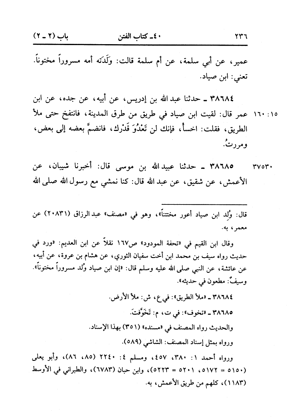 38685- حَدَّثَنَا عُبَيْدُ اللهِ بْنُ مُوسَى , قَالَ : أَخْبَرَنَا شَيْبَانُ ، عَنِ الأَعْمَشِ ، عَنْ شَقِيقٍ ، عَنْ عَبْدِ اللهِ ، قَالَ : كُنَّا نَمْشِي مَعَ رَسُولِ اللهِ صَلَّى الله عَلَيْهِ وَسَلَّمَ فَمَرَرْنَا عَلَى صِبْيَانٍ يَلْعَبُونَ ، فَتَفَرَّقُوا حِينَ رَأَوُا النَّبِيَّ صَلَّى الله عَلَيْهِ وَسَلَّمَ وَجَلَسَ ابْنُ صَيَّادٍ ، فَكَأَنَّهُ غَاظَ النَّبِيَّ صَلَّى الله عَلَيْهِ وَسَلَّمَ ، فَقَالَ لَهُ : مَا لَكَ تَرِبَتْ يَدَاك ، أَتَشْهَدُ أَنِّي رَسُولُ اللهِ ؟ فَقَالَ : أَتَشْهَدُ أَنْتَ أَنِّي رَسُولُ اللهِ ، فَقَالَ : عُمَرُ : يَا رَسُولَ اللهِ ، دَعَنْي فَلأَقْتُلْ هَذَا الْخَبِيثَ ، قَالَ : دَعْهُ فَإِنْ يَكُنِ الَّذِي تَخَوَّف فَلَنْ تَسْتَطِيعَ قَتْلَهُ. (15/160).