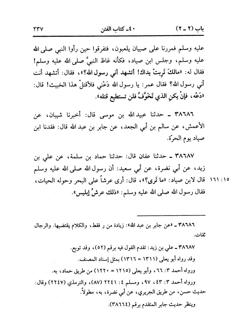 38687- حَدَّثَنَا عَفَّانُ , قَالَ : حدَّثَنَا حَمَّادُ بْنُ سَلَمَةَ ، عَنْ عَلِيِّ بْنِ زَيْدٍ ، عَنْ أَبِي نَضْرَةَ ، عَنْ أَبِي سَعِيدٍ ، أَنَّ رَسُولَ اللهِ صَلَّى الله عَلَيْهِ وَسَلَّمَ ، قَالَ لاِبْنِ صَيَّادٍ : مَا تَرَى ، قَالَ : أَرَى عَرْشًا عَلَى الْبَحْرِ وَحَوْلَهُ الْحَيَّاتُ ، فَقَالَ رَسُولُ اللهِ صَلَّى الله عَلَيْهِ وَسَلَّمَ : ذَلِكَ عَرْشُ إبْلِيسَ. (15/160).