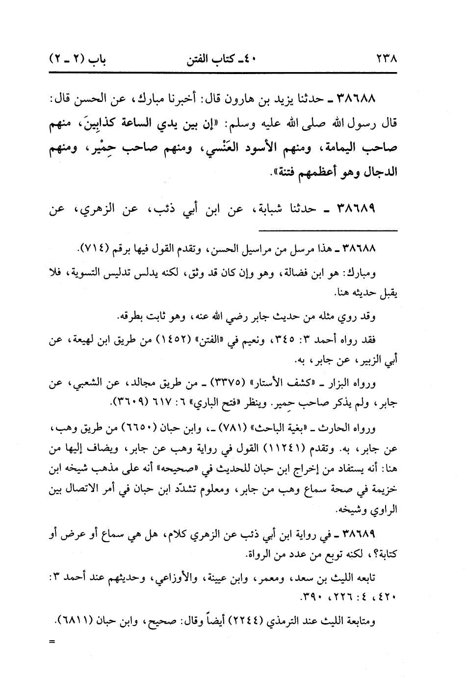 38688- حَدَّثَنَا يَزِيدُ بْنُ هَارُونَ , قَالَ : أَخْبَرَنَا مُبَارَكٌ ، عَنِ الْحَسَنِ ، قَالَ : قَالَ رَسُولُ اللهِ صَلَّى الله عَلَيْهِ وَسَلَّمَ : إِنَّ بَيْنَ يَدَي السَّاعَةِ كَذَّابِينَ مِنْهُمْ صَاحِبُ الْيَمَامَةِ وَمِنْهُمَ الأَسْوَدُ الْعَنْسِيُّ وَمِنْهُمْ صَاحِبُ حِمْيَرَ وَمِنْهُمَ الدَّجَّالُ وَهُوَ أَعْظَمُهُمْ فِتْنَةً.