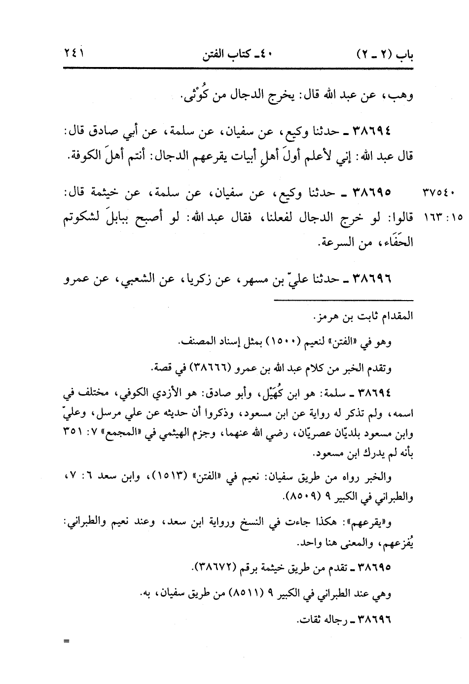 38694- حَدَّثَنَا وَكِيعٌ ، عَنْ سُفْيَانَ ، عَنْ سَلَمَةَ ، عَنْ أَبِي صَادِقٍ ، قَالَ : قَالَ عَبْدُ اللهِ : إنِّي لأَعْلَمُ أَوَّلَ أَهْلِ أَبْيَاتٍ يَقْرَعُهُمَ الدَّجَّالُ أَنْتُمْ أَهْلُ الْكُوفَةِ. (15/162)