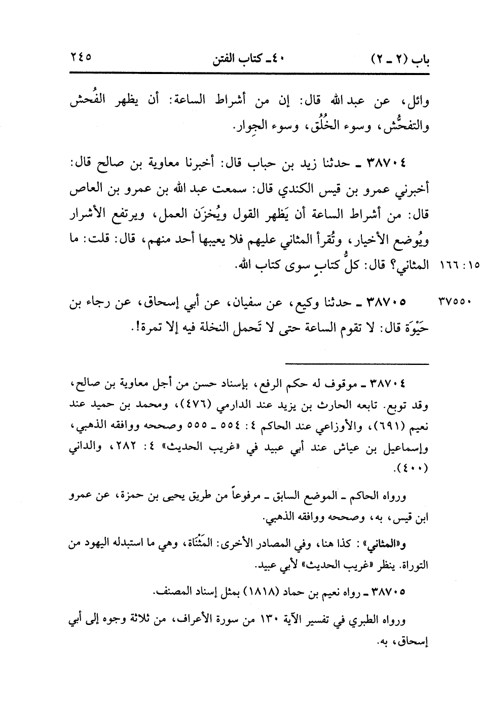 38704- حَدَّثَنَا زَيْدُ بْنُ حُبَابٍ , قَالَ : أَخْبَرَنَا مُعَاوِيَةُ بْنُ صَالِحٍ ، قَالَ : أَخْبَرَنِي عَمْرُو بْنُ قَيْسٍ الْكِنْدِيُّ ، قَالَ : سَمِعْتُ عَبْدَ اللهِ بْنَ عَمْرِو بْنِ الْعَاصِ ، قَالَ : مِنْ أَشْرَاطِ السَّاعَةِ أَنْ يَظْهَرَ الْقَوْلُ , وَيَخْزُنَ وَيَرْتَفِعَ الأَشْرَارُ , وَيُوضَعَ الأَخْيَارُ , وَتُقْرَأُ الْمَثَانِي عَلَيْهِمْ ، فَلاَ يَعِيبُهَا أَحَدٌ مِنْهُمْ ، قَالَ : قُلْتُ : مَا الْمَثَانِي ، قَالَ : كُلُّ كِتَابٍ سِوَى كِتَابِ اللهِ. (15/165)