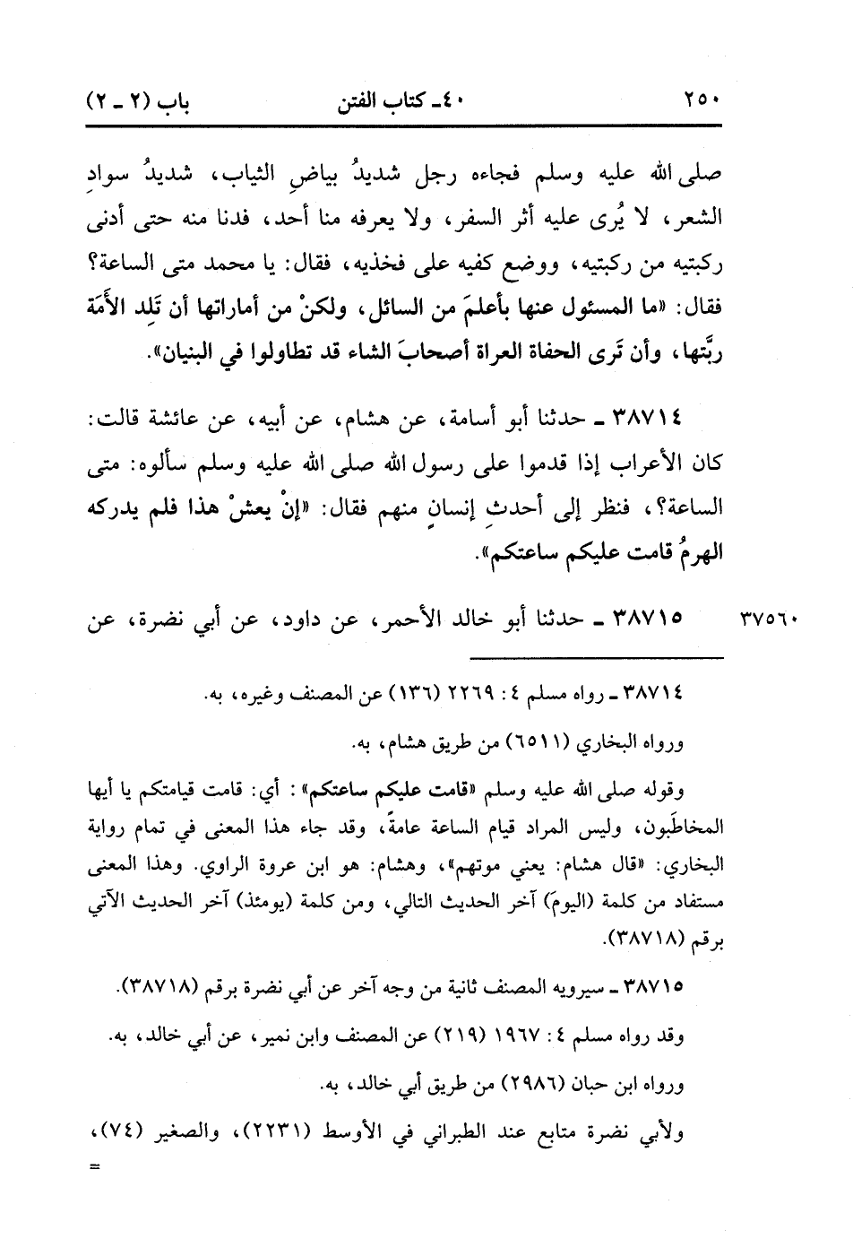 38714- حَدَّثَنَا أَبُو أُسَامَةَ ، عَنْ هِشَامٍ ، عَنْ أَبِيهِ ، عَنْ عَائِشَةَ ، قَالَتْ : كَانَ الأَعْرَابُ إِذَا قَدِمُوا عَلَى رَسُولِ اللهِ صَلَّى الله عَلَيْهِ وَسَلَّمَ سَأَلُوهُ مَتَى السَّاعَةُ ، فَنَظَرَ إِلَى أَحْدَثِ إنْسَانٍ مِنْهُمْ ، فَقَالَ : إِنْ يَعِشْ هَذَا فَلَمْ يُدْرِكْهُ الْهَرَمُ قَامَتْ عَلَيْكُمْ سَاعَتُكُمْ. (15/168).