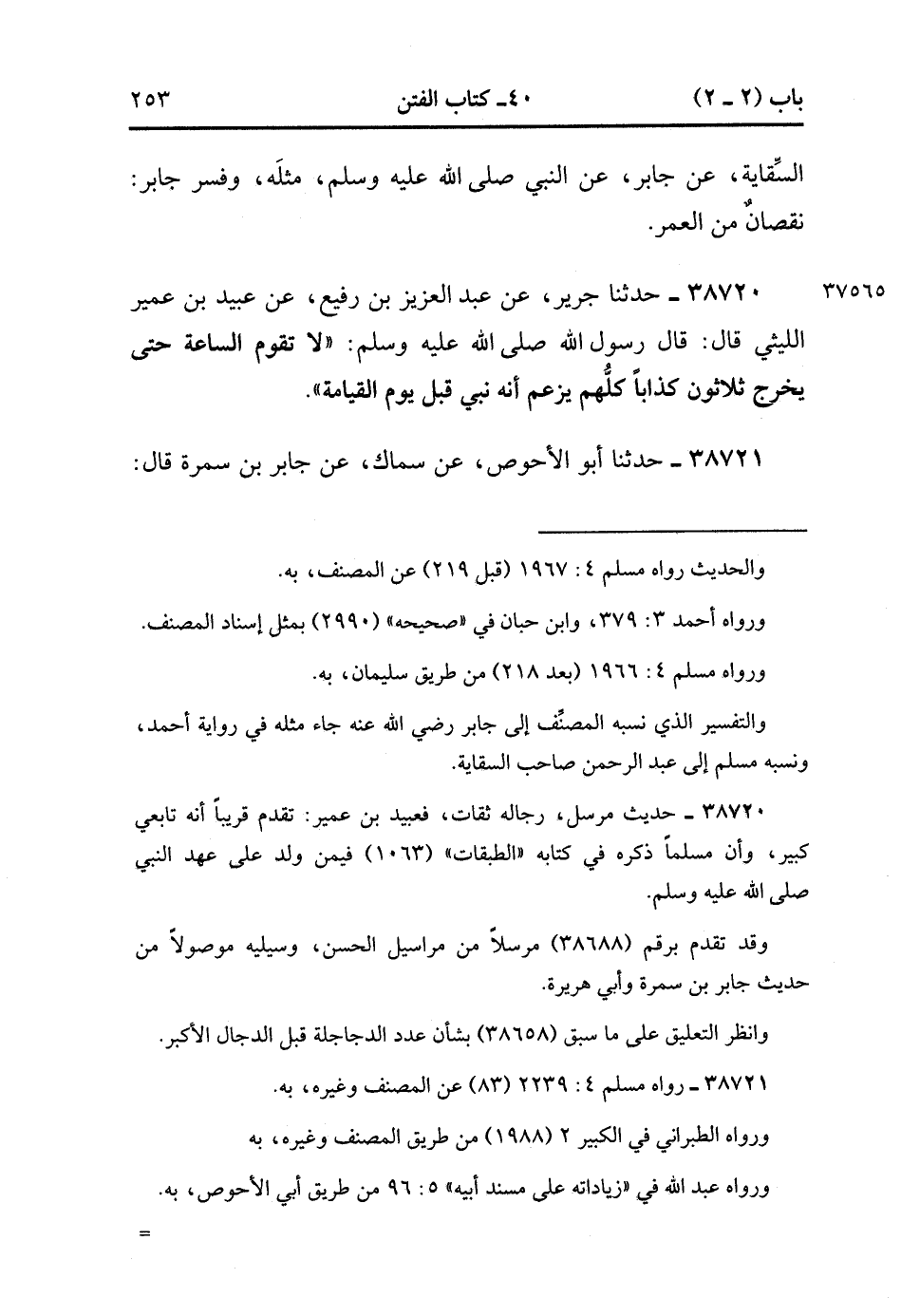 38721- حَدَّثَنَا أَبُو الأَحْوَصِ ، عَنْ سِمَاكٍ ، عَنْ جَابِرِ بْنِ سَمُرَةَ ، قَالَ : سَمِعْتُ رَسُولَ اللهِ صَلَّى الله عَلَيْهِ وَسَلَّمَ يَقُولُ : إِنَّ بَيْنَ يَدَيَ السَّاعَةِ كَذَّابِينَ ، فَقُلْتُ : أَنْتَ سَمِعْته مِنْ رَسُولِ اللهِ صَلَّى الله عَلَيْهِ وَسَلَّمَ ؟ قَالَ : نَعَمْ. (15/170).