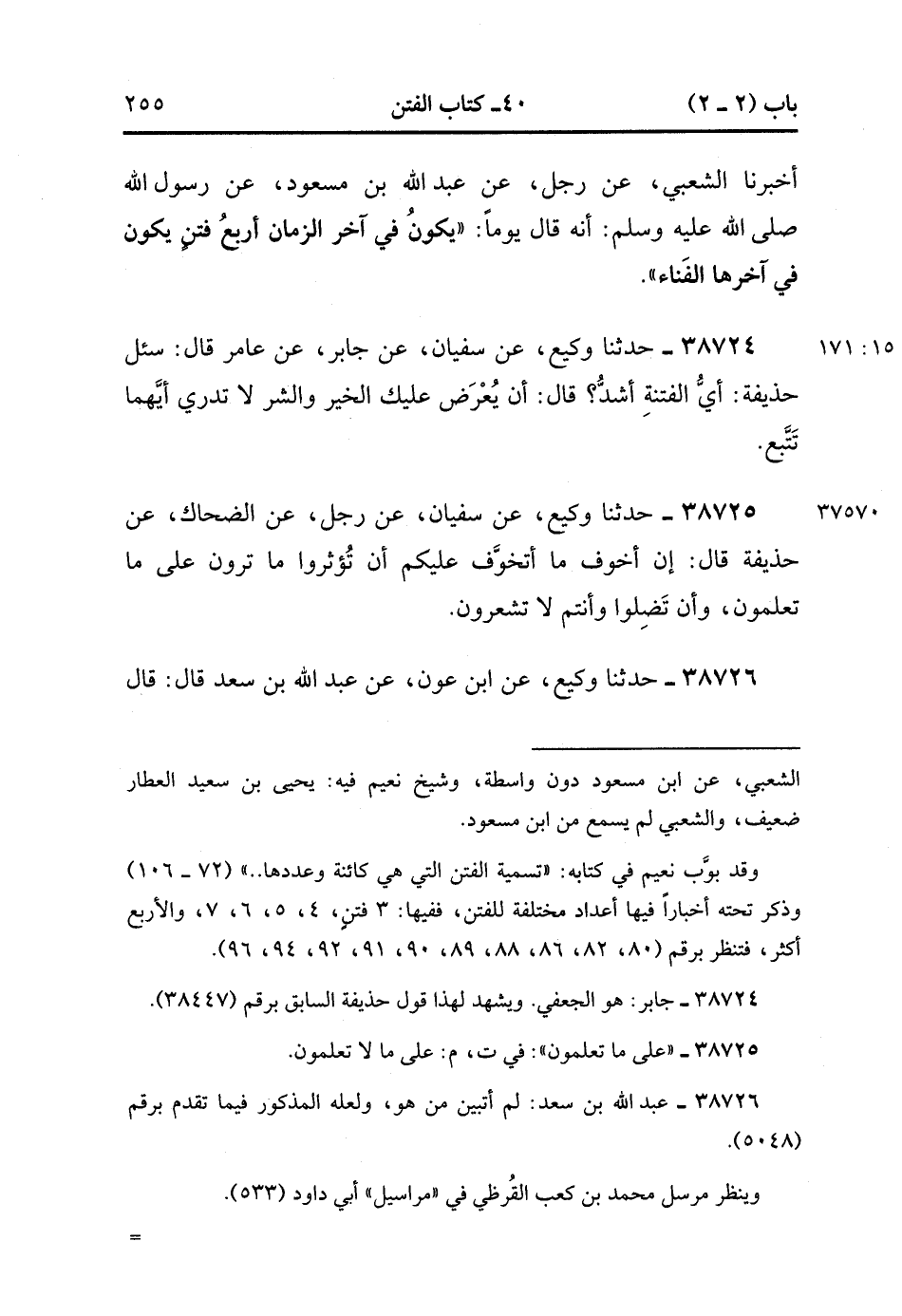 38724- حَدَّثَنَا وَكِيعٌ ، عَنْ سُفْيَانَ ، عَنْ جَابِرٍ ، عَنْ عَامِرٍ ، قَالَ : سُئِلَ حُذَيْفَةُ : أَيُّ الْفِتْنَةِ أَشَدُّ ؟ قَالَ : أَنْ يُعْرَضَ عَلَيْك الْخَيْرُ وَالشَّرُّ لاَ تَدْرِي أَيَّهُمَا تَتْبَعُ.