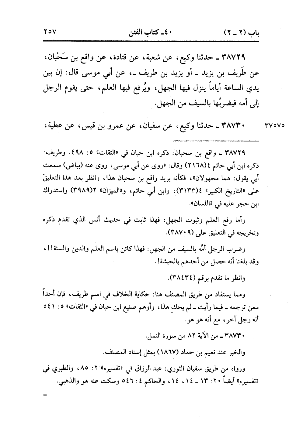 38729- حَدَّثَنَا وَكِيعٌ ، عَنْ شُعْبَةَ ، عَنْ قَتَادَةَ ، عَنْ وَاقِعِ بْنِ سَحْبَانَ ، عَنْ طَرِيفِ بْنِ يَزِيدَ ، أَوْ يَزِيدَ بْنِ طَرِيفٍ ، عَنْ أَبِي مُوسَى ، قَالَ : إِنَّ بَيْنَ يَدَيَ السَّاعَةِ أَيَّامًا يَنْزِلُ فِيهَا الْجَهْلُ وَيُرْفَعُ فِيهَا الْعِلْمُ حَتَّى يَقُومَ الرَّجُلُ إِلَى أُمِّهِ فَيَضْرِبُهَا بِالسَّيْفِ مِنَ الْجَهْلِ.