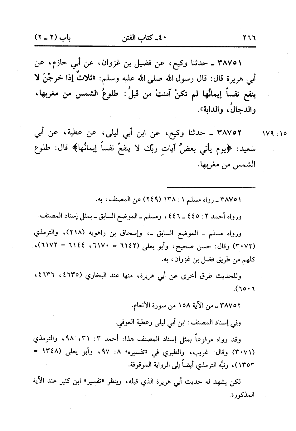 38752- حَدَّثَنَا وَكِيعٌ ، عَنِ ابْنِ أَبِي لَيْلَى ، عَنْ عَطِيَّةَ ، عَنْ أَبِي سَعِيدٍ {يَوْمَ يَأْتِي بَعْضُ آيَاتِ رَبِّكَ لاَ يَنْفَعُ نَفْسًا إيمَانُهَا} قَالَ : طُلُوعُ الشَّمْسِ مِنْ مَغْرِبِهَا. (15/179).