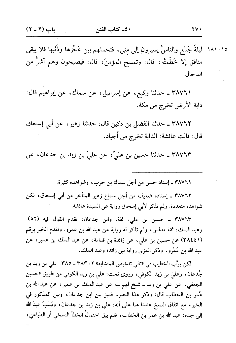 38763- حَدَّثَنَا حُسَيْنُ بْنُ عَلِيٍّ ، عَنْ عَلِيِّ بْنِ جُدْعَانَ ، عَنْ عَبْدِ الْمَلِكِ بْنِ عُمَيْرٍ ، عَنْ عَبْدِ اللهِ بْنِ عَمْرٍو ، قَالَ : تَخْرُجُ الدَّابَّةُ مِنْ جَبَلِ أَجْيَادَ أَيَّامَ التَّشْرِيقِ وَالنَّاسُ بِمِنًى ، قَالَ : فَلِذَلِكَ حُيِّيَ سَابِقُ الْحَاجِّ إِذَا جَاءَ بِسَلاَمَةِ النَّاسِ. (15/181).