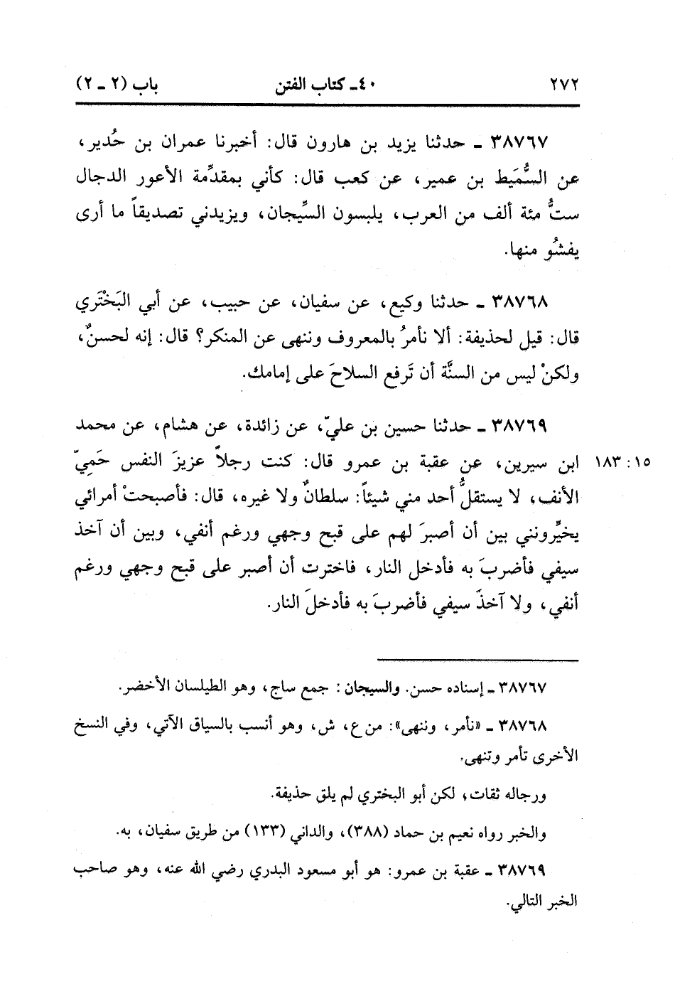 38769- حَدَّثَنَا حُسَيْنُ بْنُ عَلِيٍّ ، عَنْ زَائِدَةَ ، عَنْ هِشَامٍ ، عَنْ مُحَمَّدِ بْنِ سِيرِينَ ، عَنْ عُقْبَةَ بْنِ عَمْرٍو ، قَالَ : كُنْتُ رَجُلاً عَزِيزَ النَّفْسِ حَمِيَّ الأَنْفِ لاَ يَسْتَقِلُّ أَحَدٌ مِنِّي شَيْئًا ، سُلْطَانٌ وَلاَ غَيْرُهُ ، قَالَ : فَأَصْبَحْت أُمَرَائِي يُخَيِّرُونَنِي بَيْنَ أَنْ أَصْبِرَ لَهُمْ عَلَى قُبْحِ وَجْهِي وَرَغْمِ أَنْفِي وَبَيْنَ أَنْ آخُذَ سَيْفِي فَأَضْرِبَ بِهِ فَأَدْخُلَ النَّارَ ، فَاخْتَرْت أَنْ أَصْبِرَ عَلَى قُبْحِ وَجْهِي وَرَغْمِ أَنْفِي ، وَلاَ آخُذُ سَيْفِي فَأَضْرِبَ فَأَدْخُلَ النَّارَ. (15/182).