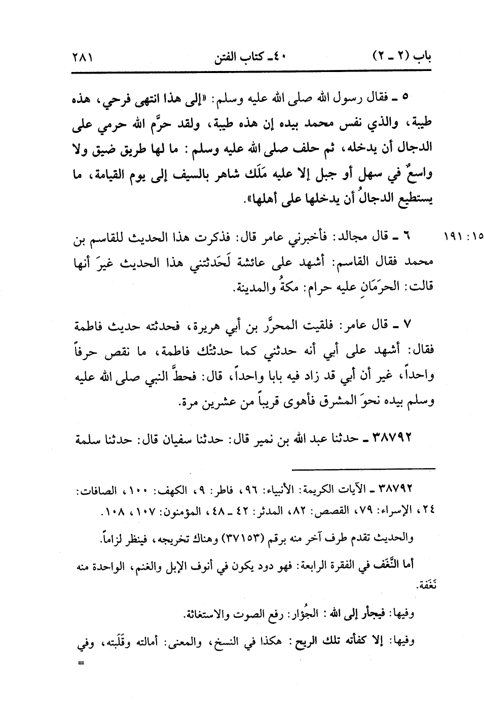 7- قَالَ عَامِرٌ : فَلَقِيت الْمُحَرَّرَ بْنَ أَبِي هُرَيْرَةَ فَحَدَّثْته حَدِيثَ عَائِشَةَ ، فَقَالَ : أَشْهَدُ عَلَى أَبِي ، أَنَّهُ حَدَّثَنِي كَمَا حَدَّثَتْك عَائِشَةُ مَا نَقَصَ حَرْفًا وَاحِدًا غَيْرَ أَنَّ أَبِي قَدْ زَادَ فِيهِ بَابًا وَاحِدًا ، قَالَ : فَحَطَّ النَّبِيُّ صَلَّى الله عَلَيْهِ وَسَلَّمَ بِيَدِهِ نَحْوَ الْمَشْرِقِ فَأَهْوَى قَرِيبًا مِنْ عِشْرِينَ مَرَّةً. (15/191).