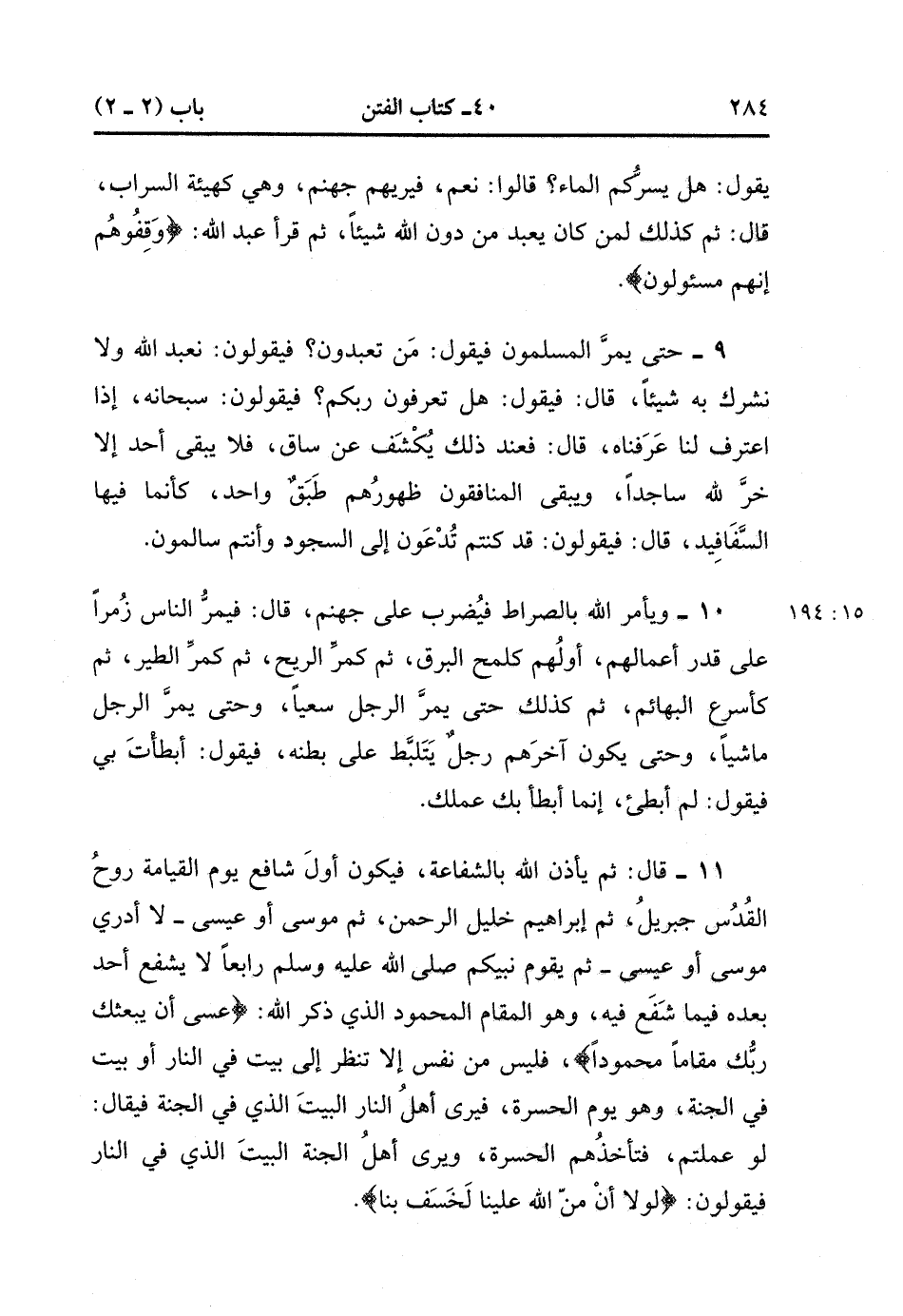 8- ثُمَّ يَلْقَى النَّصَارَى فَيَقُولُ : مَنْ تَعْبُدُونَ ؟ قَالُوا : نَعْبُدُ الْمَسِيحَ ، قَالَ : يَقُولُ : هَلْ يَسُرُّكُمُ الْمَاءُ ، قَالُوا : نَعَمْ ، فَيُرِيهِمْ جَهَنَّمَ وَهِيَ كَهَيْئَةِ السَّرَابِ ، قَالَ : ثُمَّ كَذَلِكَ لِمَنْ كَانَ يَعْبُدُ مِنْ دُونِ اللهِ شَيْئًا ، ثُمَّ قَرَأَ عَبْدُ اللهِ : {وَقِفُوهُمْ إنَّهُمْ مَسْئُولُونَ}
