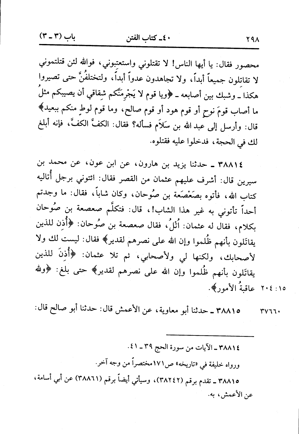 38814- حَدَّثَنَا يَزِيدُ بْنُ هَارُونَ ، عَنِ ابْنِ عَوْنٍ ، عَنْ مُحَمَّدِ بْنِ سِيرِينَ ، قَالَ : أَشْرَفَ عَلَيْهُمْ عُثْمَان مِنَ الْقَصْرِ ، فَقَالَ : ائْتُونِي بِرَجُلٍ أُتَالِيهِ كِتَابَ اللهِ ، فَأَتَوْهُ بِصَعْصَعَةَ بْنِ صُوحَانَ ، وَكَانَ شَابًّا ، فَقَالَ : مَا وَجَدْتُمْ أَحَدًا تَأْتُونِي غَيْرَ هَذَا الشَّابِّ ، قَالَ : فَتَكَلَّمَ صَعْصَعَةُ بْنُ صُوحَانَ بِكَلاَمُ ، فَقَالَ لَهُ عُثْمَان : اتْلُ ، فَقَالَ صَعْصَعَةُ : {أُذِنَ لِلَّذِينَ يُقَاتَلُونَ بِأَنَّهُمْ ظُلِمُوا وَإِنَّ اللَّهَ عَلَى نَصْرِهِمْ لَقَدِيرٌ} ، فَقَالَ : لَيْسَتْ لَكَ وَلاَ لأَصْحَابِكَ ، وَلَكِنَّهَا لِي وَلأَصْحَابِي ، ثُمَّ تَلاَ عُثْمَان : {أُذِنَ لِلَّذِينَ يُقَاتَلُونَ بِأَنَّهُمْ ظُلِمُوا وَإِنَّ اللَّهَ عَلَى نَصْرِهِمْ لَقَدِيرٌ} حَتَّى بَلَغَ {وَلِلَّهِ عَاقِبَةُ الأُمُورِ} . (15/203)