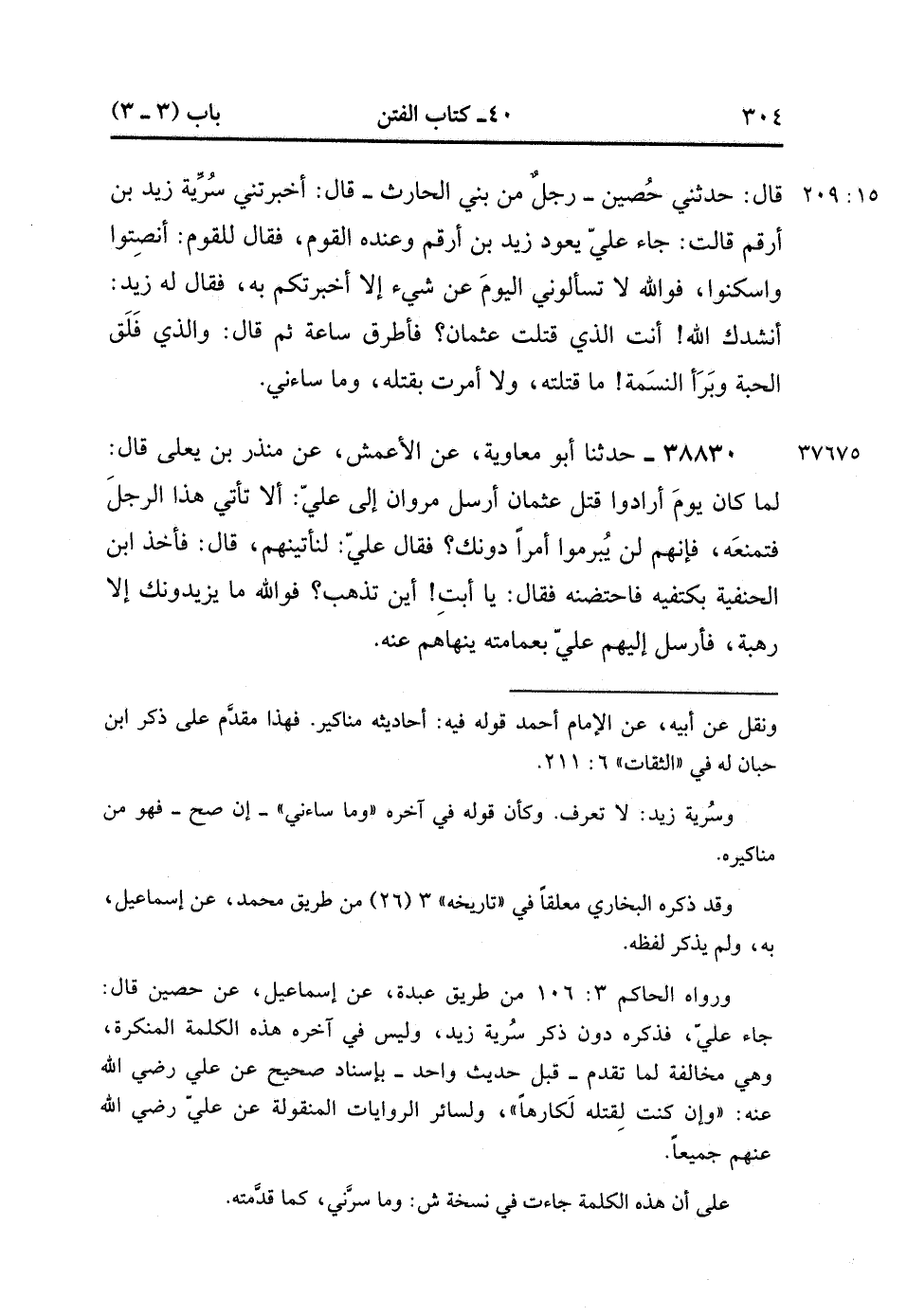 38829- حَدَّثَنَا مُحَمَّدُ بْنُ بِشْرٍ , قَالَ : حدَّثَنَا إسْمَاعِيلُ بْنُ أَبِي خَالِدٍ ، قَالَ : حَدَّثَنِي حُصَيْنٌ رَجُلٌ مِنْ بَنِي الْحَارِثِ ، قَالَ : أَخْبَرَتْنِي سُرِّيَّةُ زَيْدِ بْنِ أَرْقَمَ ، قَالَتْ : جَاءَ عَلِيٌّ يَعُودُ زَيْدَ بْنَ أَرْقَمَ ، وَعِنْدَهُ الْقَوْمُ ، فَقَالَ لِلْقَوْمِ : أَنْصِتُوا وَاسْكُتُوا ، فَوَاللهِ لاَ تَسْأَلُونِي الْيَوْمَ شَيْئًا إِلاَّ أَخْبَرْتُكُمْ بِهِ ، فَقَالَ لَهُ زَيْدٌ : أَنْشُدُك اللَّهَ ، أَنْتَ قَتَلْت عُثْمَانَ ، فَأَطْرَقَ سَاعَةً ، ثُمَّ قَالَ : وَالَّذِي فَلَقَ الْحَبَّةَ وَبَرَأَ النَّسَمَةَ ، مَا قَتَلْته وَلاَ أَمَرْت بِقَتْلِهِ ، وَمَا سَاءَنِي. (15/208)
