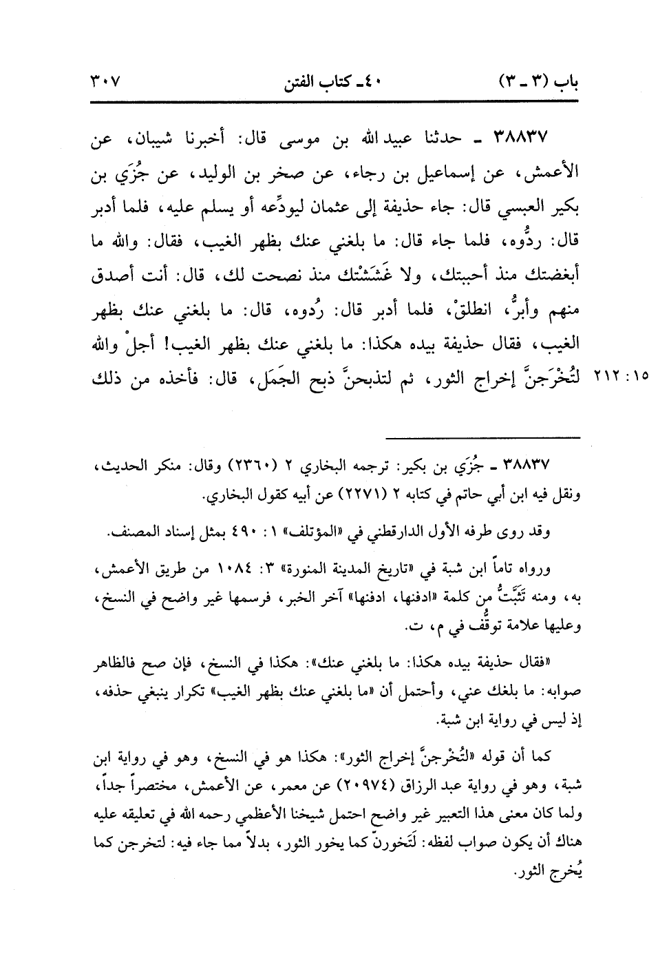 38837- حَدَّثَنَا عُبَيْدُ اللهِ بْنُ مُوسَى , قَالَ : أَخْبَرَنَا شَيْبَانُ ، عَنِ الأَعْمَشِ ، عَنْ إسْمَاعِيلَ بْنِ رَجَاءٍ ، عَنْ صَخْرِ بْنِ الْوَلِيدِ ، عَنْ جُزَيِّ بْنِ بُكَيْر الْعَبْسِيِّ ، قَالَ : جَاءَ حُذَيْفَةُ إِلَى عُثْمَانَ لِيُوَدِّعَهُ ، أَوْ يُسَلِّمَ عَلَيْهِ ، فَلَمَّا أَدْبَرَ ، قَالَ : رُدُّوهُ ، فَلَمَّا جَاءَ ، قَالَ : مَا بَلَغَنِي عَنْك بِظَهْرِ الْغَيْبِ ، فَقَالَ : وَاللهِ مَا أَبْغَضْتُك مُنْذُ أَحْبَبْتُك ، وَلاَ غَشَشْتُك مُنْذُ نَصَحْت لَكَ ، قَالَ أَنْتَ أَصْدَقُ مِنْهُمْ وَأَبَرُّ ، انْطَلِقْ ، فَلَمَّا أَدْبَرَ ، قَالَ : رُدُّوهُ ، قَالَ : مَا بَلَغَنِي عَنْك بِظَهْرِ الْغَيْبِ ، فَقَالَ : حُذَيْفَةُ بِيَدِهِ هَكَذَا ، مَا بَلَغَنِي عَنْك بِظَهْرِ الْغَيْبِ ، أَجَلْ وَاللهِ لَتُخْرَجَنَّ إخْرَاجَ الثَّوْرِ ، ثُمَّ لَتُذْبَحَنَّ ذَبْحَ الْجَمَلِ ، قَالَ : فَأَخَذَهُ مِنْ ذَلِكَ أَفكلٌ ، فَأَرْسَلَ إِلَى مُعَاوِيَةَ فَجِيءَ بِهِ يُدْفَعُ ، قَالَ : هَلْ تَدْرِي مَا قَالَ حُذَيْفَةُ ، قَالَ : وَاللهِ لَتُخْرَجَنَّ إخْرَاجَ الثَّوْرِ وَلَتُذْبَحَنَّ ذَبْحَ الْجَمَلِ ، فَقَالَ : ادفنها ادفنها. (15/211).