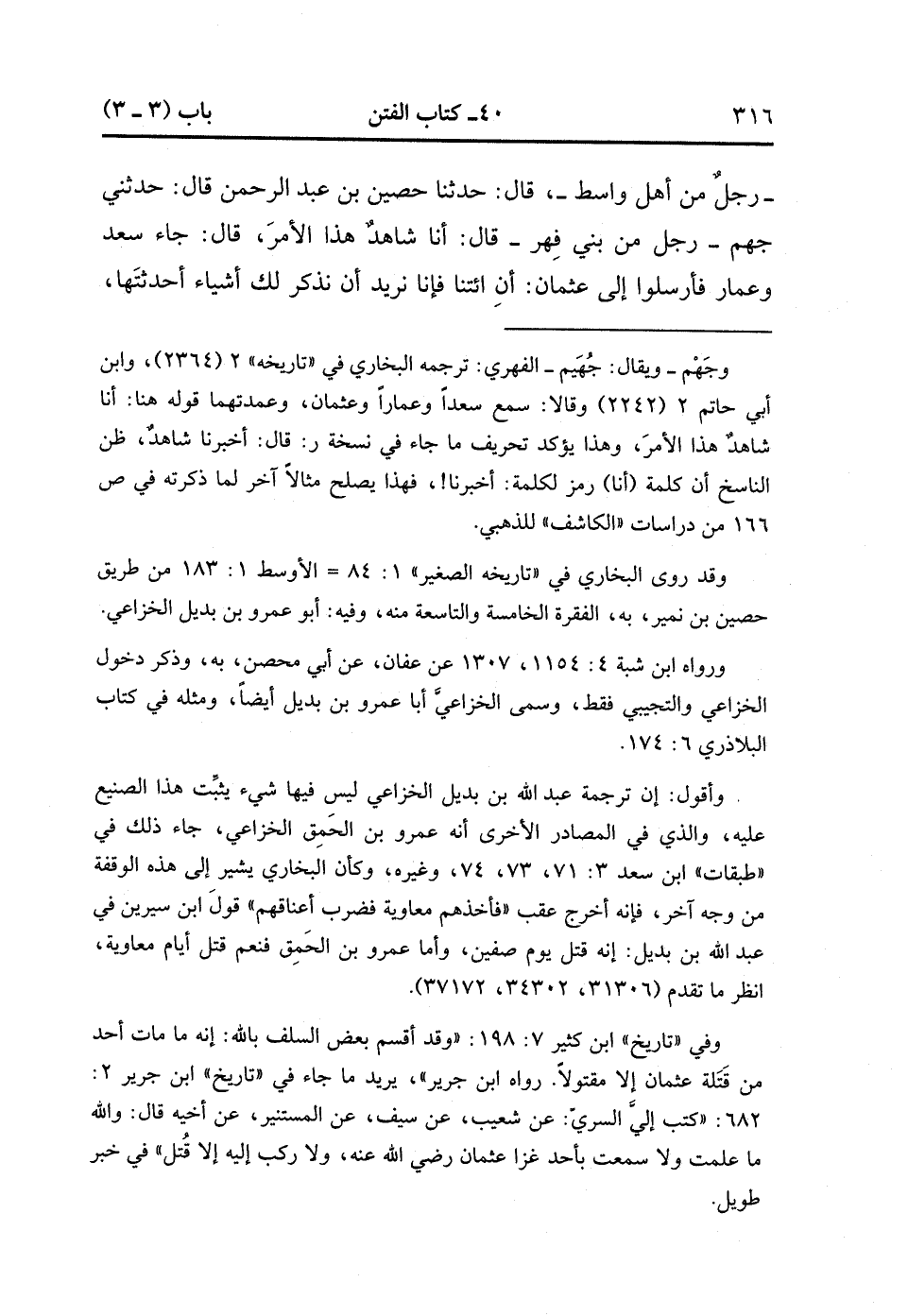 2- قَالَ : فَانْصَرَفَ سَعْدٌ ، وَأَبِي عَمَّارٍ أَنْ يَنْصَرِفَ ، قَالَهَا أَبُو مِحْصَنٍ مَرَّتَيْنِ ، قَالَ : فَتَنَاوَلَهُ رَسُولُ عُثْمَانَ فَضَرَبَهُ ، قَالَ : فَلَمَّا اجْتَمَعُوا لِلْمِيعَادِ وَمَنْ مَعَهُمْ ، قَالَ لَهُمْ عُثْمَان مَا تَنْقِمُونَ مِنِّي ، قَالُوا : نَنْقِمُ عَلَيْك ضَرْبَك عَمَّارًا ، قَالَ : قَالَ عُثْمَان : جَاءَ سَعْدٌ وَعَمَّارٌ فَأَرْسَلْتُ إلَيْهِمَا ، فَانْصَرَفَ سَعْدٌ ، وَأَبِي عَمَّارٌ أَنْ يَنْصَرِفَ ، فَتَنَاوَلَهُ رَسُولٌ مِنْ غَيْرِ أَمْرِي فَوَاللهِ (15/220) مَا أَمَرْت وَلاَ رَضِيت ، فَهَذِهِ يَدِي لِعَمَّارٍ فَلْيَصْطَبِر ، قَالَ أَبُو مِحْصَنٍ : يَعْنِي يَقْتَصُّ.