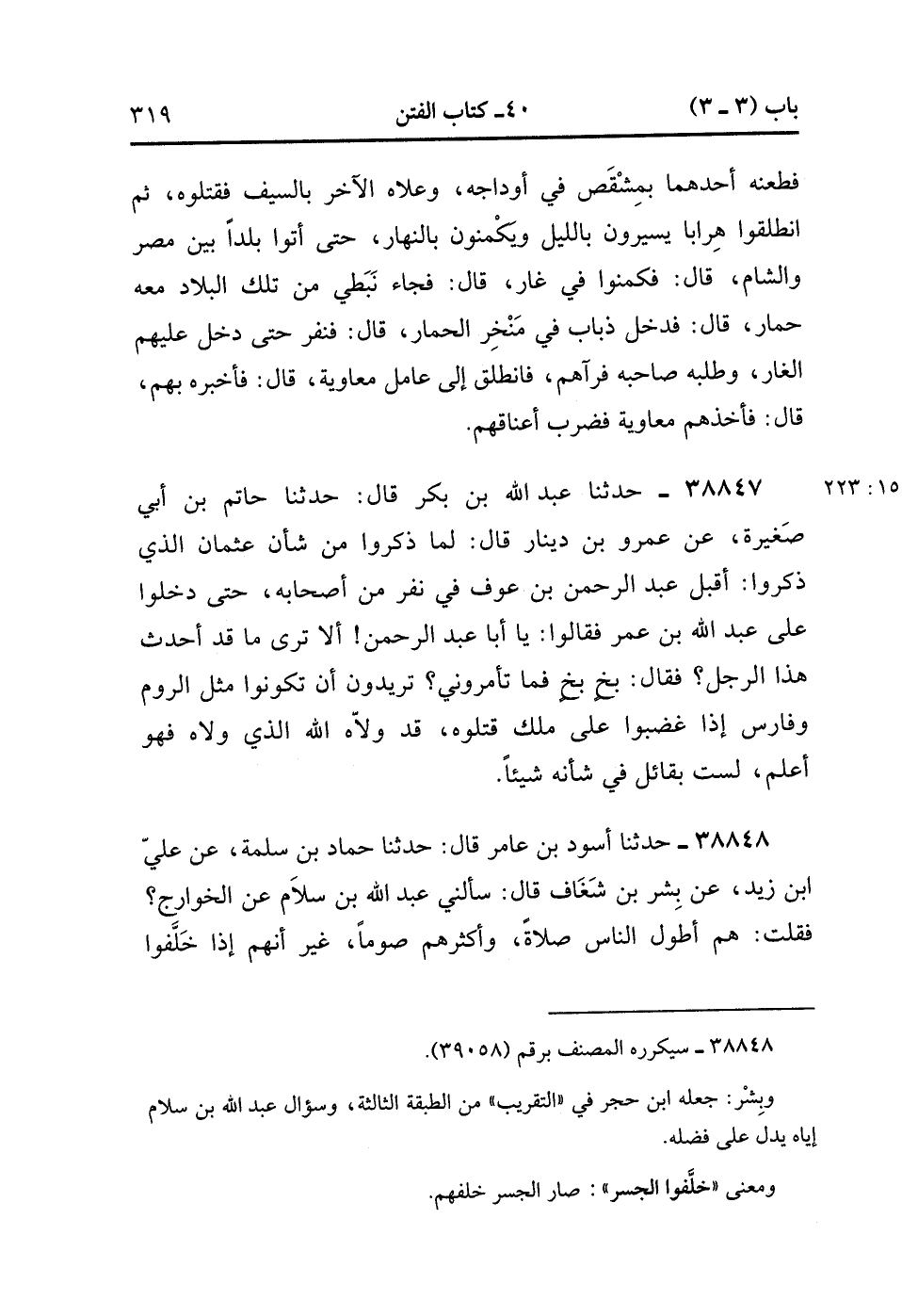 38848- حَدَّثَنَا أَسْوَدُ بْنُ عَامِرٍ , قَالَ : حدَّثَنَا حَمَّادُ بْنُ سَلَمَةَ ، عَنْ عَلِيِّ بْنِ زَيْدٍ ، عَنْ بِشْرِ بْنِ شَغَافَ قَالَ : سَأَلَنِي عَبْدُ اللهِ بْنُ سَلاَمٍ ، عَنِ الْخَوَارِجِ ، فَقُلْتُ لَهُمْ : أَطْوَلُ النَّاسِ صَلاَةً وَأَكْثَرُهُمْ صَوْمًا غَيْرَ أَنَّهُمْ إِذَا خَلَّفُوا الْجِسْرَ أَهَرَاقُوا الدِّمَاءَ وَأَخَذُوا الأَمْوَالَ ، قَالَ : لاَ تَسْأَلْ عَنْهُمْ إَلاَّ ذَا أَمَّا إِنِّي قَدْ قُلْتُ لَهُمْ : لاَ تَقْتُلُوا عُثْمَانَ ، دَعُوهُ ، فَوَاللهِ لَئِنْ تَرَكْتُمُوهُ إحْدَى عَشْرَةَ لَيَمُوتَنَّ عَلَى فِرَاشِهِ مَوْتًا فَلَمْ يَفْعَلُوا وَإِنَّهُ لَمْ يُقْتَلْ نَبِيٌّ إِلاَّ قُتِلَ بِهِ سَبْعُونَ أَلْفًا مِنَ النَّاسِ وَلَمْ يُقْتَلْ خَلِيفَةٌ إِلاَّ قُتِلَ بِهِ خَمْسَةٌ وَثَلاَثُونَ أَلْفًا. (15/223).