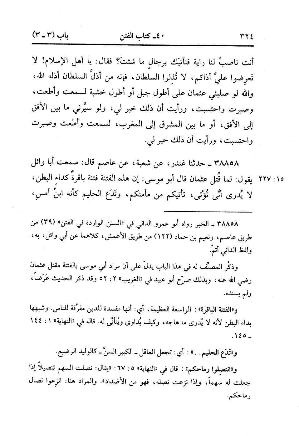 38858- حَدَّثَنَا غُنْدَرٌ ، عَنْ شُعْبَةَ ، عَنْ عَاصِمٍ ، قَالَ سَمِعْت أَبَا وَائِلٍ يَقُولُ : لَمَّا قُتِلَ عُثْمَان ، قَالَ أَبُو مُوسَى : إِنَّ هَذِهِ الْفِتْنَةَ فِتْنَةٌ بَاقِرَةٌ كَدَاءِ الْبَطْنِ ، لاَ يدْرَى أَنَّى نُؤْتَى ، تَأْتِيكُمْ مِنْ مَأْمَنِكُمْ وَتَدَعُ الْحَلِيمَ كَأَنَّهُ ابْنُ أَمْسِ ، قَطِّعُوا أَرْحَامَكُمْ وَانْتَصِلُوا رِمَاحَكُمْ. (15/226).