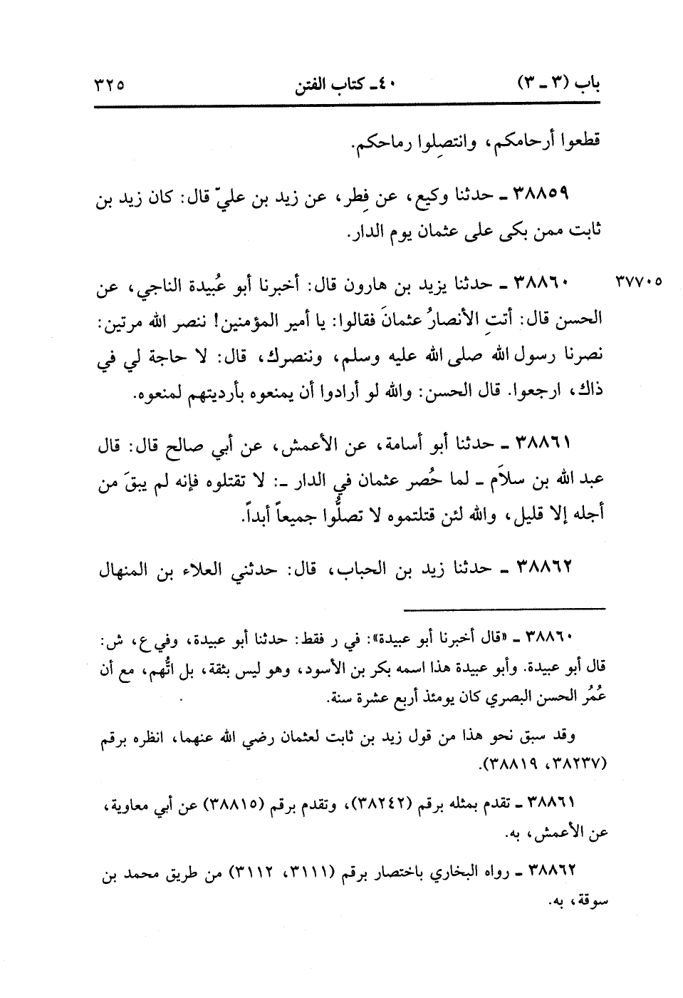 38861- حَدَّثَنَا أَبُو أُسَامَةَ ، عَنِ الأَعْمَشِ ، عَنْ أَبِي صَالِحٍ ، قَالَ : قَالَ عَبْدُ اللهِ بْنُ سَلاَمٍ لَمَّا حُصِرَ عُثْمَان فِي الدَّارِ : لاَ تَقْتُلُوهُ فَإِنَّهُ لَمْ يَبْقَ مِنْ أَجَلِهِ إِلاَّ قَلِيلٌ وَاللهِ لَئِنْ قَتَلْتُمُوهُ لاَ تُصَلُّوا جَمِيعًا أَبَدًا. (15/227).