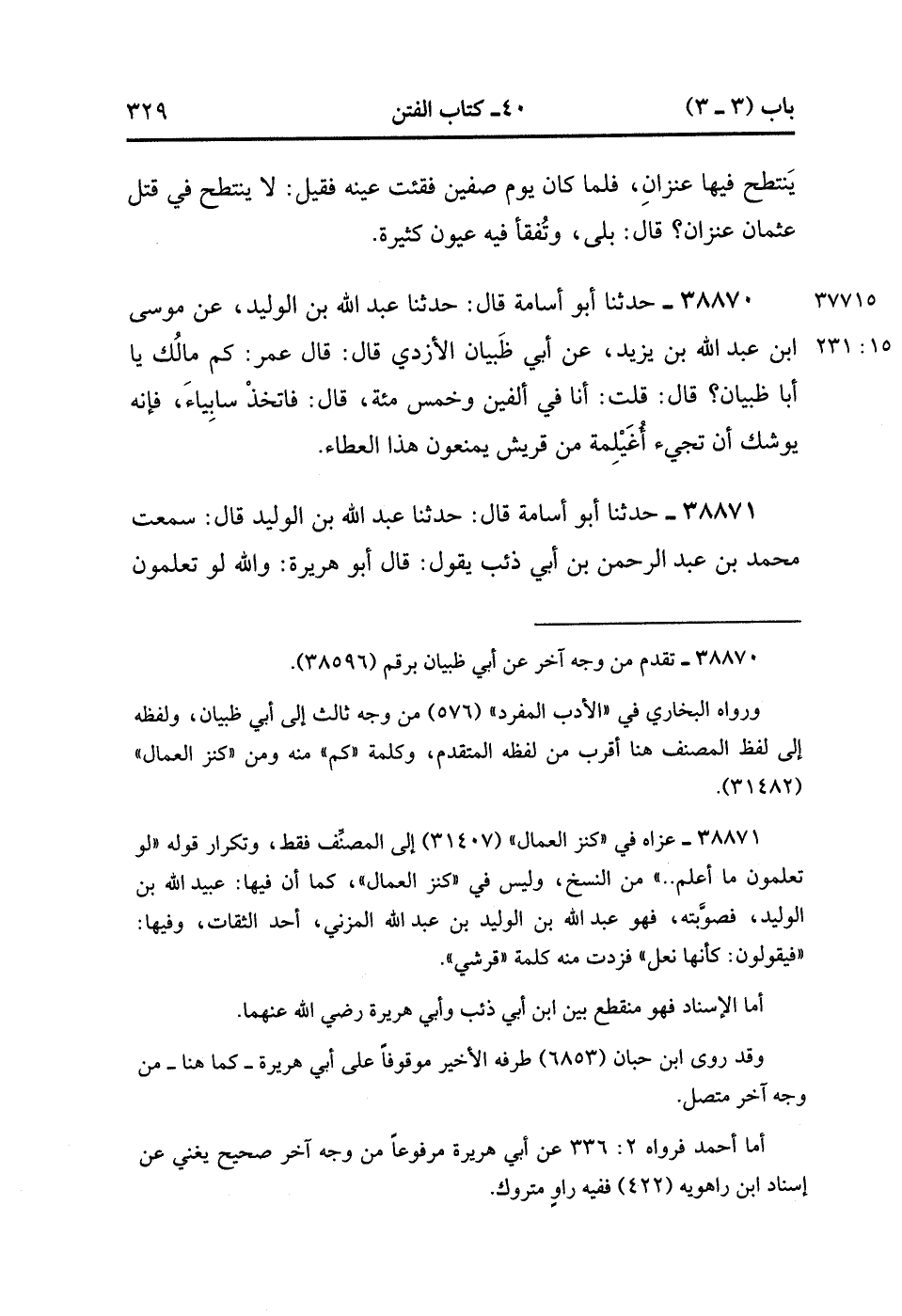 38869- حَدَّثَنَا الْفَضْلُ بْنُ دُكَيْنٍ , قَالَ : حدَّثَنَا سَعِيدُ بْنُ عَبْدِ الرَّحْمَنِ ، قَالَ : حَدَّثَنَا مُحَمَّدُ بْنُ سِيرِينَ ، قَالَ : لَمَّا قُتِلَ عُثْمَان ، قَالَ عَدِيُّ بْنُ حَاتِمٍ : لاَ يَنْتَطِحُ فِيهَا عَنزَانِ ، فَلَمَّا كَانَ يَوْمُ صِفِّينَ فُقِئَتْ عَيْنُهُ فَقِيلَ : لاَ تَنْتَطِحُ فِي قَتْلِ عُثْمَانَ عَنْزَانِ ، قَالَ بَلَى ، وَتُفْقَأُ فِيهِ عُيُونٌ كَثِيرَةٌ.