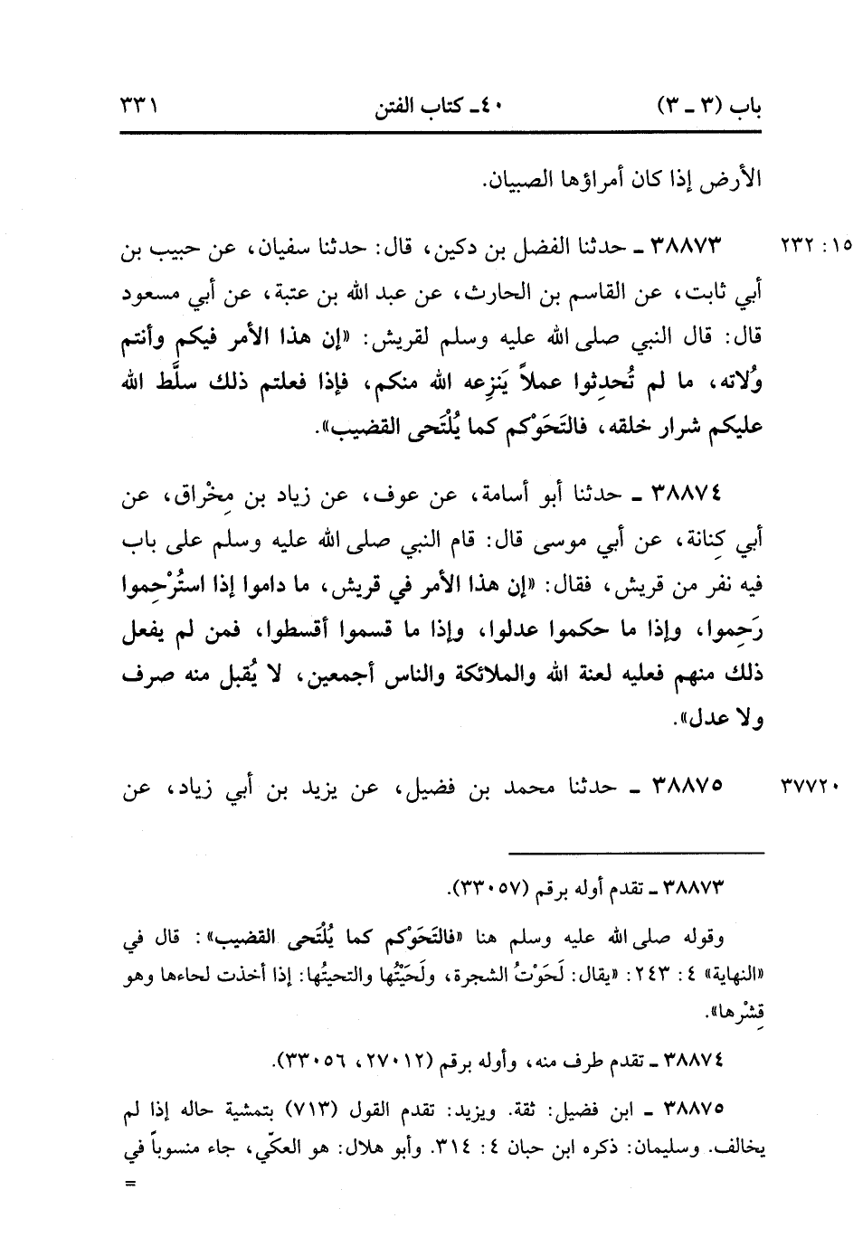 38874- حَدَّثَنَا أَبُو أُسَامَةَ ، عَنْ عَوْفٍ ، عَنْ زِيَادِ بْنِ مِخْرَاقٍ ، عَنْ أَبِي كِنَانَةَ ، عَنْ أَبِي مُوسَى ، قَالَ : قامَ النَّبِيُّ صَلَّى الله عَلَيْهِ وَسَلَّمَ عَلَى بَابٍ فِيهِ نَفَرٌ مِنْ قُرَيْشٍ ، فَقَالَ : إِنَّ هَذَا الأَمْرَ فِي قُرَيْشٍ مَادَامُوا إِذَا اسْتُرْحِمُوا رَحِمُوا ، وَإِذَا مَا حَكَمُوا عَدَلُوا ، وَإِذَا مَا قَسَمُوا أَقْسَطُوا ، فَمَنْ لَمْ يَفْعَلْ ذَلِكَ مِنْهُمْ فَعَلَيْهِ لَعْنَةُ اللهِ وَالْمَلاَئِكَةِ وَالنَّاسِ أَجْمَعِينَ ، لاَ يُقْبَلُ مِنْهُ صَرْفٌ وَلاَ عَدْلٌ. (15/232).