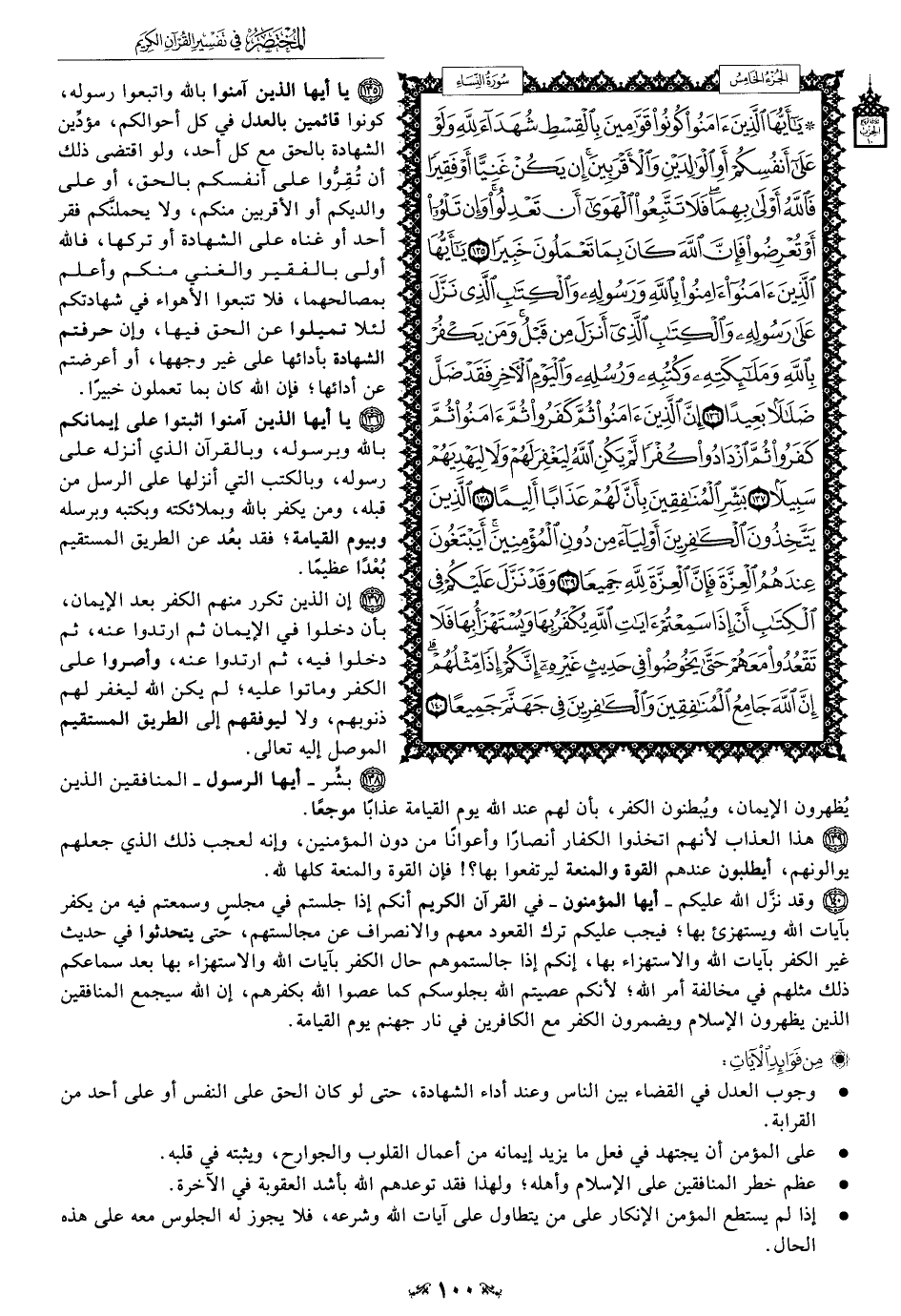 135 - يا أيها الذين آمنوا بالله واتبعوا رسوله، كونوا قائمين بالعدل في كل أحوالكم، مؤدِّين الشهادة بالحق مع كل أحد، ولو اقتضى ذلك أن تُقِرُّوا على أنفسكم بالحق، أو على والديكم أو الأقربين منكم، ولا يحملنَّكم فقر أحد أو غناه على الشهادة أو تركها، فالله أولى بالفقير والغني منكم وأعلم بمصالحهما، فلا تتبعوا الأهواء في شهادتكم لئلا تميلوا عن الحق فيها، وإن حرفتم الشهادة بأدائها على غير وجهها، أو أعرضتم عن أدائها؛ فإن الله كان بما تعملون خبيرًا.