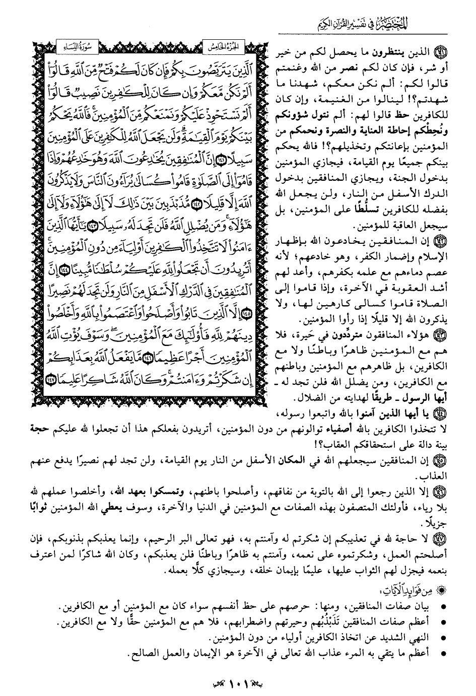 141 - الذين ينتظرون ما يحصل لكم من خير أو شر، فإن كان لكم نصر من الله وغنمتم قالوا لكم: ألم نكن معكم، شهدنا ما شهدتم؟! لينالوا من الغنيمة، وإن كان للكافرين حظ قالوا لهم: ألم نتول شؤونكم ونُحِطْكم إحاطة العناية والنصرة ونحمكم من المؤمنين بإعانتكم وتخذيلهم؟! فالله يحكم بينكم جميعًا يوم القيامة، فيجازي المؤمنين بدخول الجنة، ويجازي المنافقين بدخول الدرك الأسفل من النار، ولن يجعل الله بفضله للكافرين تسلطًا على المؤمنين، بل سيجعل العاقبة للمؤمنين.