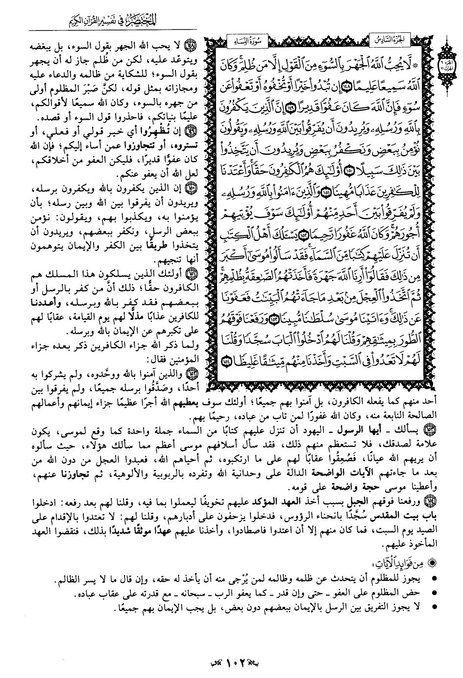 148 - لا يحب الله الجهر بقول السوء، بل يبغضه ويتوعّد عليه، لكن من ظُلم جاز له أن يجهر بقول السوء؛ للشكاية من ظالمه والدعاء عليه ومجازاته بمثل قوله، لكنَ صَبْرَ المظلوم أولى من جهره بالسوء، وكان الله سميعًا لأقوالكم، عليمًا بنياتكم، فاحذروا قول السوء أو قصده.