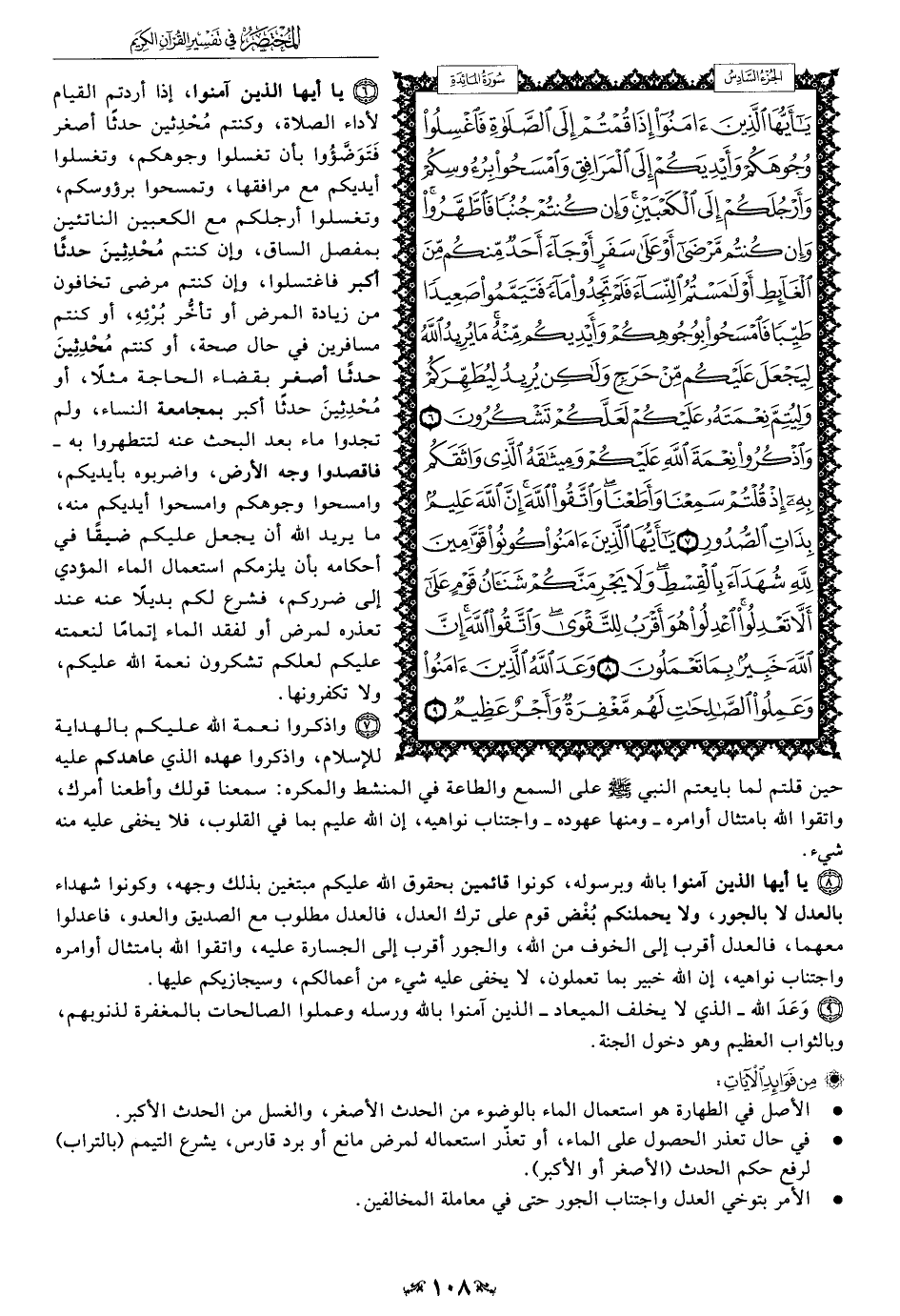 6 - يا أيها الذين آمنوا، إذا أردتم القيام لأداء الصلاة، وكنتم مُحْدِثين حدثًا أصغر فَتَوَضَّؤُوا بأن تغسلوا وجوهكم، وتغسلوا أيديكم مع مرافقها، وتمسحوا برؤوسكم، وتغسلوا أرجلكم مع الكعبين الناتئين بمفصل الساق، وإن كنتم مُحْدِثِينَ حدثًا أكبر فاغتسلوا، وإن كنتم مرضى تخافون من زيادة المرض أو تأخُّر بُرْئِهِ، أو كنتم مسافرين في حال صحة، أو كنتم مُحْدِثِينَ حدثًا أصغر بقضاء الحاجة مثلًا، أو مُحْدِثِينَ حدثًا أكبر بمجامعة النساء، ولم تجدوا ماء بعد البحث عنه لتتطهروا به- فاقصدوا وجه الأرض، واضربوه بأيديكم، وامسحوا وجوهكم وامسحوا أيديكم منه، ما يريد الله أن يجعل عليكم ضيقًا في أحكامه بأن يلزمكم استعمال الماء المؤدي إلى ضرركم، فشرع لكم بديلًا عنه عند تعذره لمرض أو لفقد الماء إتمامًا لنعمته عليكم لعلكم تشكرون نعمة الله عليكم، ولا تكفرونها.