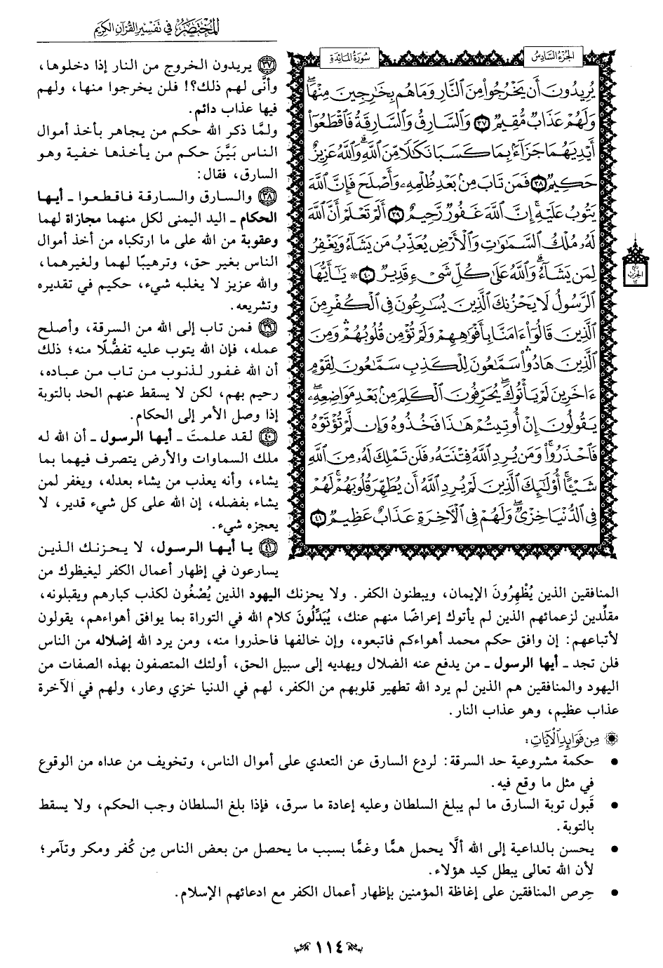 38 - والسارق والسارقة فاقطعوا -أيها الحكام- اليد اليمنى لكل منهما مجازاة لهما وعقوبة من الله على ما ارتكباه من أخذ أموال الناس بغير حق، وترهيبًا لهما ولغيرهما، والله عزيز لا يغلبه شي، حكيم في تقديره وتشريعه.