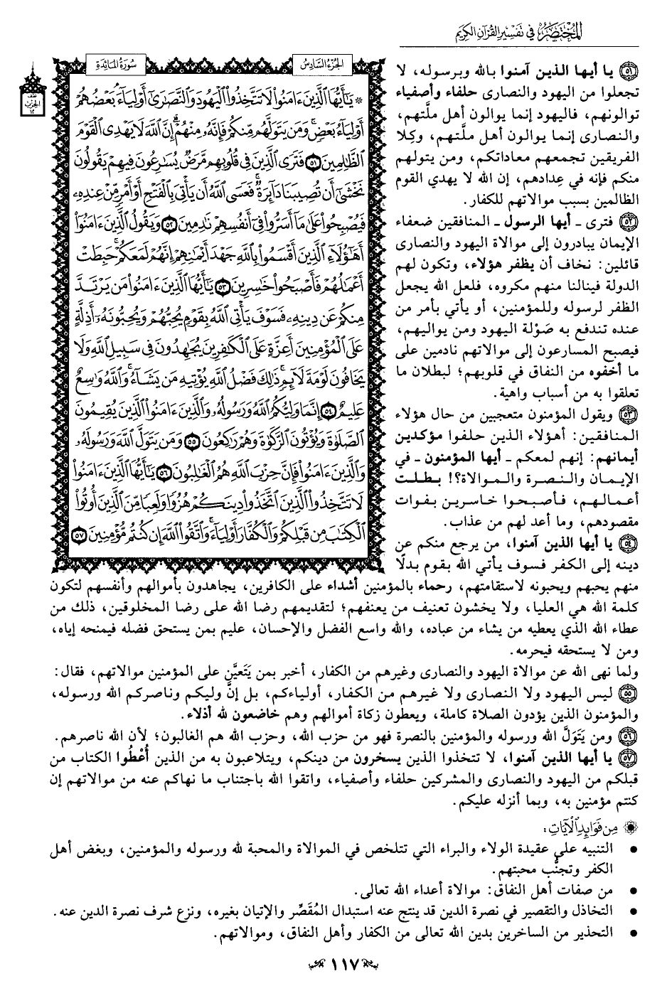51 - يا أيها الذين آمنوا بالله وبرسوله لا تجعلوا من اليهود والنصارى حلفاء وأصفياء توالونهم، فاليهود إنما يوالون أهل ملَّتهم، والنصارى إنما يوالون أهل ملتهم، وكِلا الفريقين تجمعهم معاداتكم، ومن يتولهم منكم فإنه في عِدادهم، إن الله لا يهدي القوم الظالمين بسبب موالاتهم للكفار.
