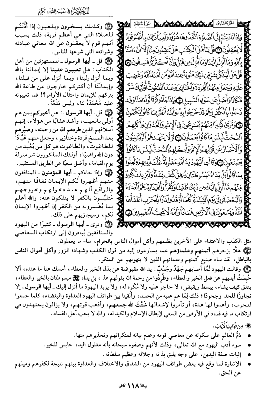 64 - وقالت اليهود لَمَّا أصابهم جَهْدٌ وجَدْبٌ: يد الله مقبوضة عن بذل الخير والعطاء، أمسك عنا ما عنده، ألا حُبِسَتْ أيديهم عن فعل الخير والعطاء، وطُرِدُوا من رحمة الله بقولهم هذا، بل يداه عز وجل مبسوطتان بالخير والعطاء، ينفق كيف يشاء، يبسط ويقبض، لا حاجر عليه ولا مُكْره له، ولا يزيد اليهود ما أنزل إليك -أيها الرسول- إلا تجاوزًا للحد وجحودًا؛ ذلك لِمَا هم عليه من الحسد، وأَلقينا بين طوائف اليهود العداوة والبغضاء، كلما جمعوا للحرب، وأعدوا لها عدة، أو تآمروا لإشعالها شَتَّتَ الله جمعهم، وأذهب قوتهم، ولا يزالون يجتهدون في ارتكاب ما فيه فساد في الأرض من السعي لإبطال الإسلام والكيد له والله لا يحب أهل الفساد.
